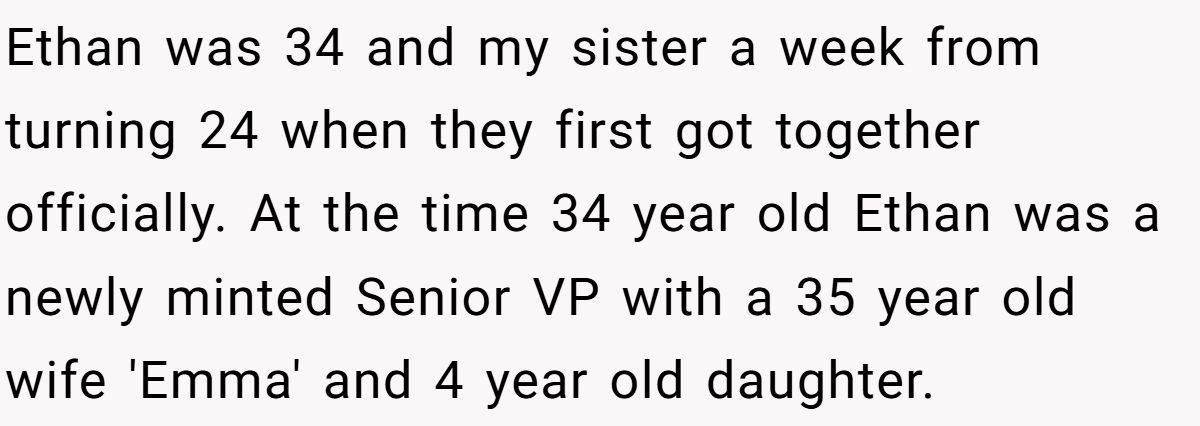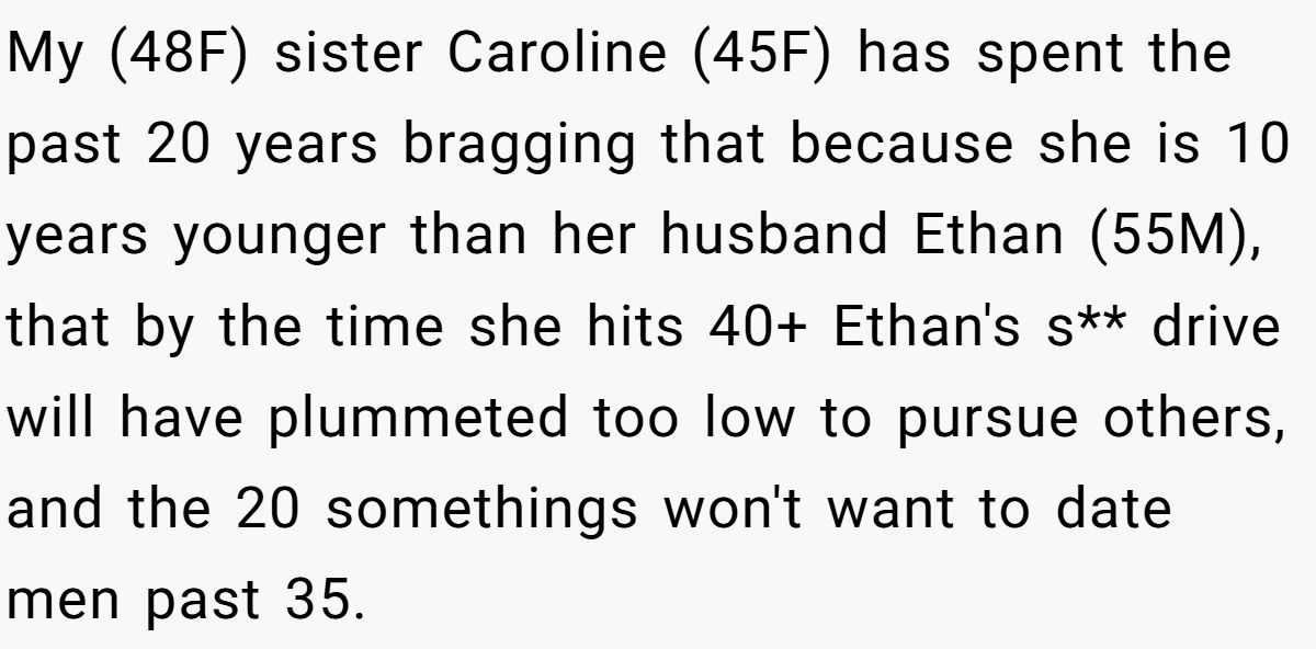 Talk about a real-life soap opera twist! This AITA post dives into a messy family feud full of age gaps, bragging, and betrayal. The Redditor, 48, shares how her sister Caroline, 45, spent years bragging that being 10 years younger than her husband, Ethan, 55, would keep her forever desirable.