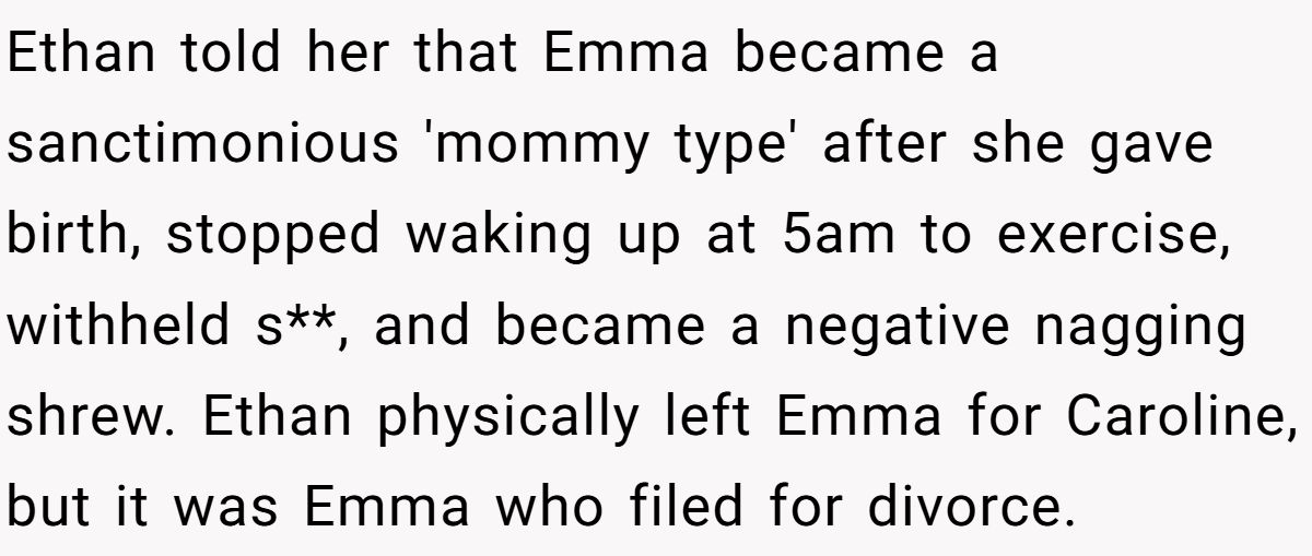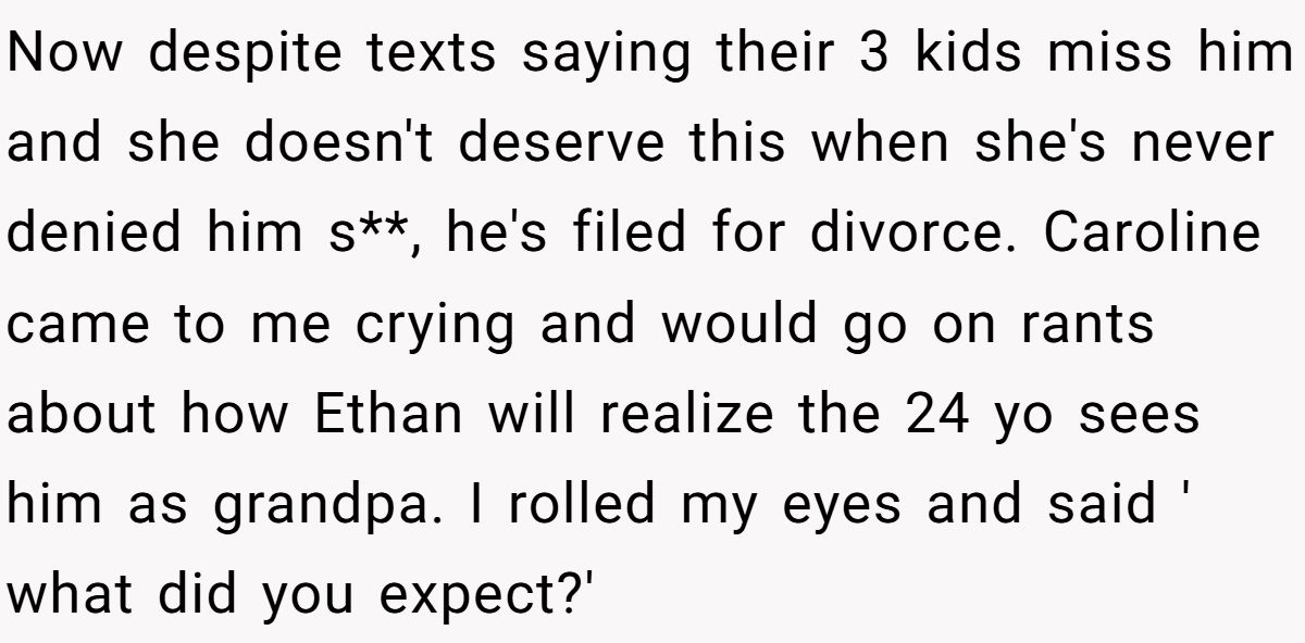 But the joke’s on her, Ethan just left her for his 24-year-old assistant, and now Caroline is heartbroken and furious. When she turned to her sister for comfort, she got a blunt “What did you expect?” instead, and now the whole family is up in arms. Was it too harsh, or just the truth?