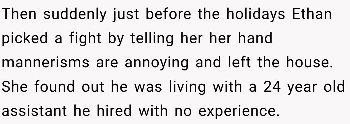 After two decades of bragging and dismissing warnings, Ethan left her for a 24-year-old assistant. Her sister’s blunt “What did you expect?” wasn’t exactly a hug, but after years of smug comments, it’s easy to see why patience ran out.