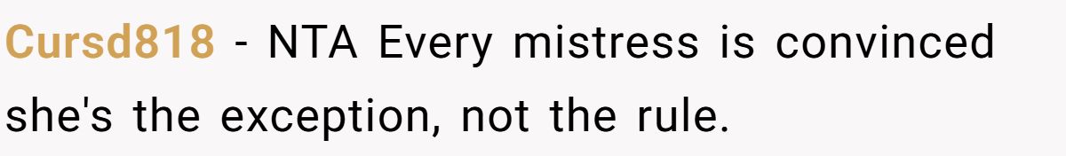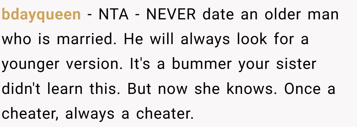 Reddit users back a person’s candid take on a sister’s doomed romance with a cheating older man, citing the inevitability of his pattern.