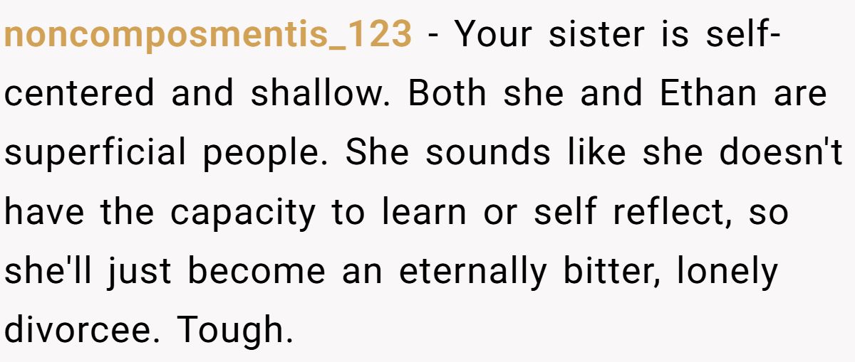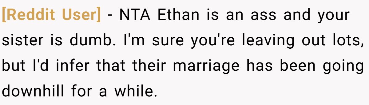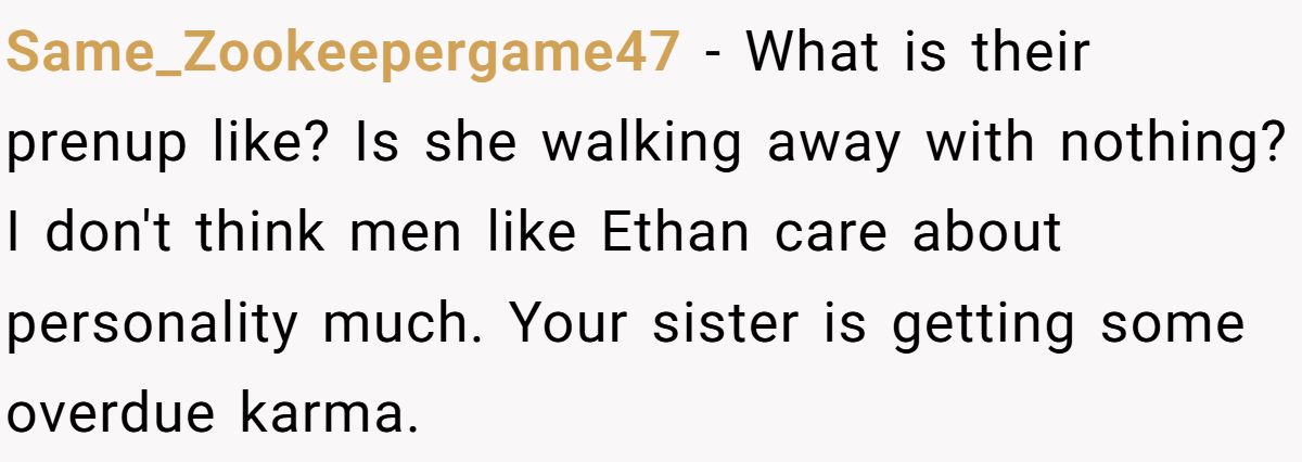 Reddit users slam a sister’s naive involvement with cheater Ethan, with one citing a similar pattern of trading wives and another pondering her karma via prenup.