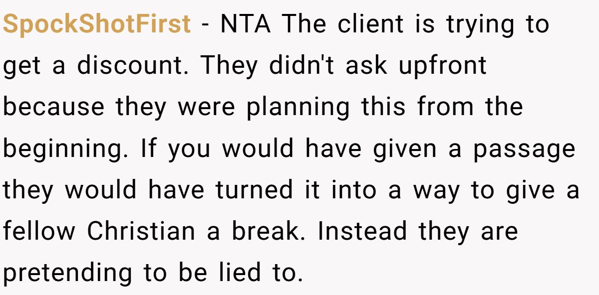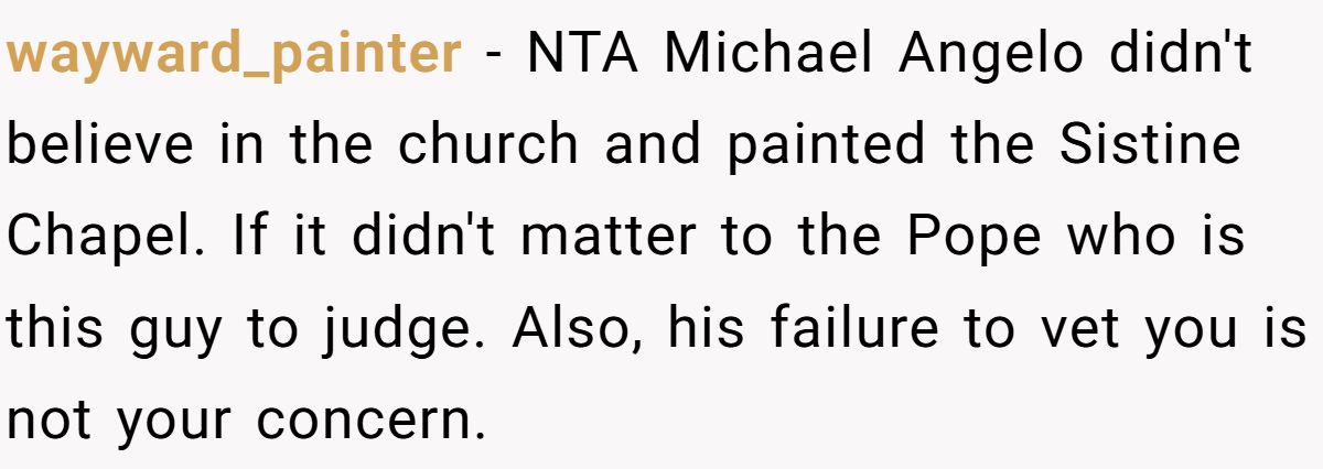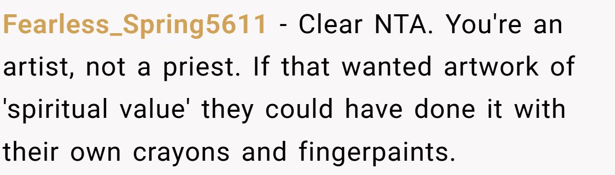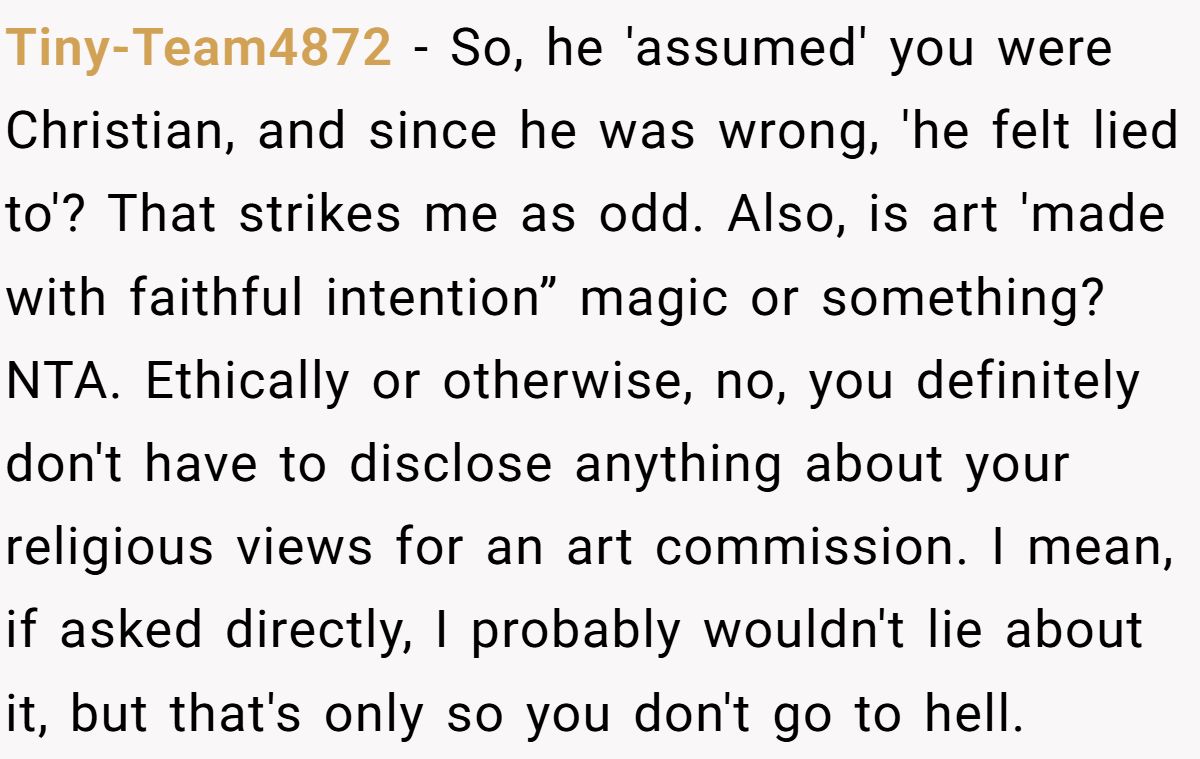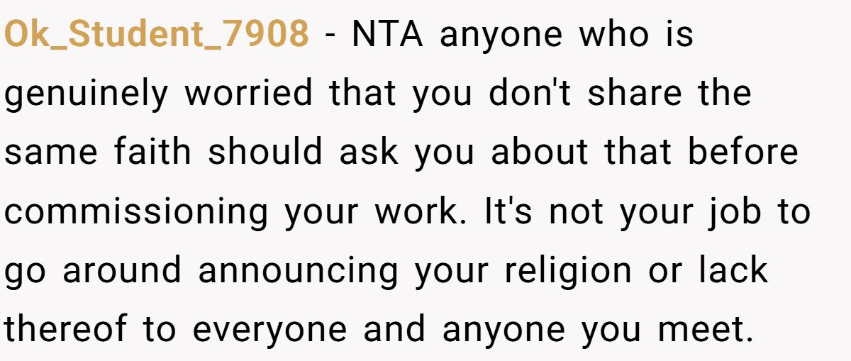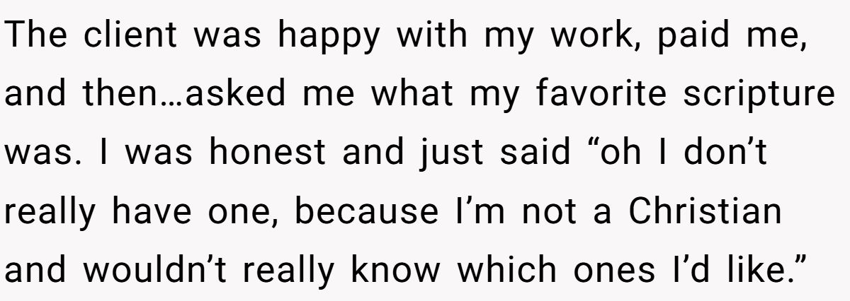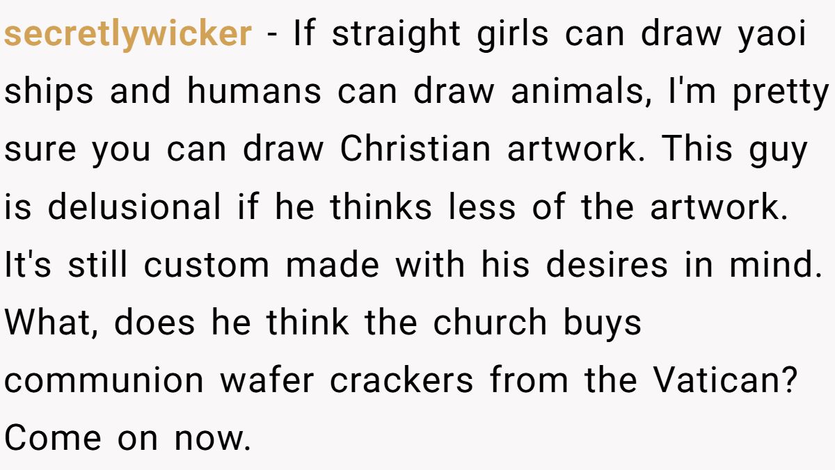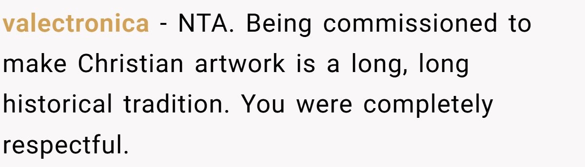 A Redditor recently shared a surprisingly modern moral dilemma: Should an artist disclose their religion before accepting a commission? One talented creator was hired to produce a stunning piece full of Christian iconography—complete with ornate crosses, saints, and scripture. The client loved it. Until he asked a casual question: “What’s your favorite Bible verse?” Her answer? A calm and honest, “Oh, I’m not a Christian.”