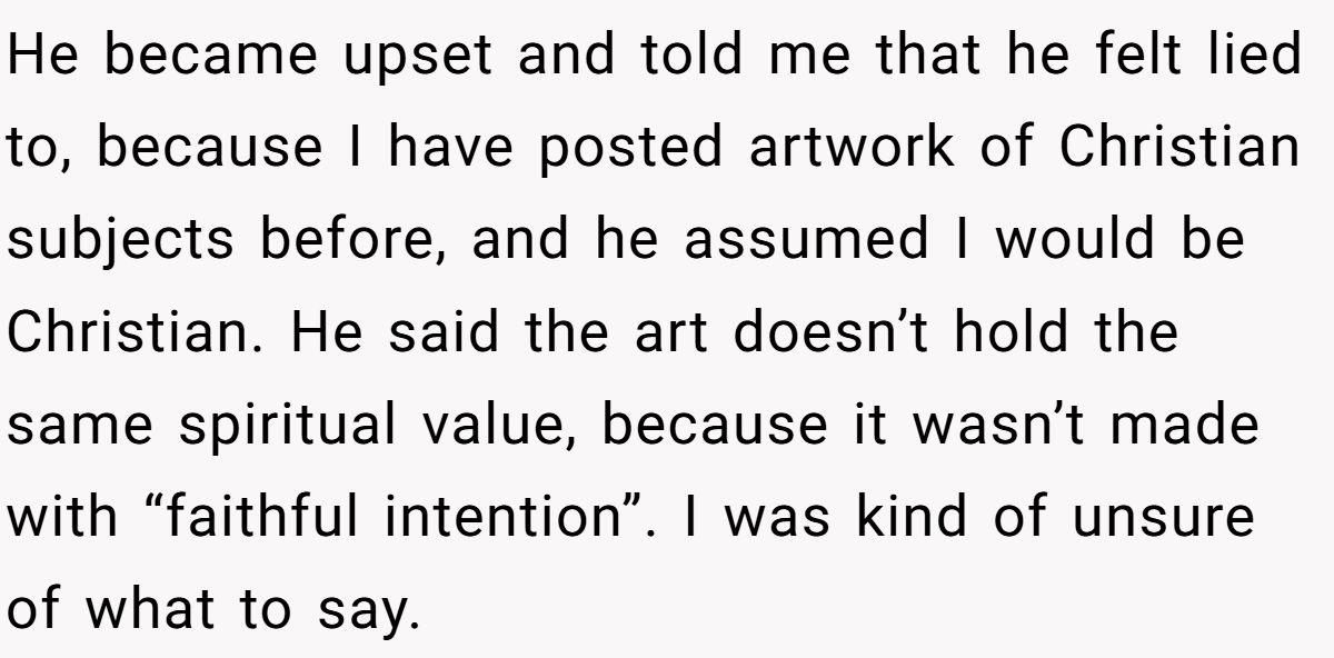 Suddenly, the mood shifted. The client, once thrilled, now said the artwork “lacked spiritual value” and felt deceived. Even though he never asked about her religion before—and despite the fact that she delivered exactly what he requested—he claimed that her lack of “faithful intention” made it feel inauthentic.