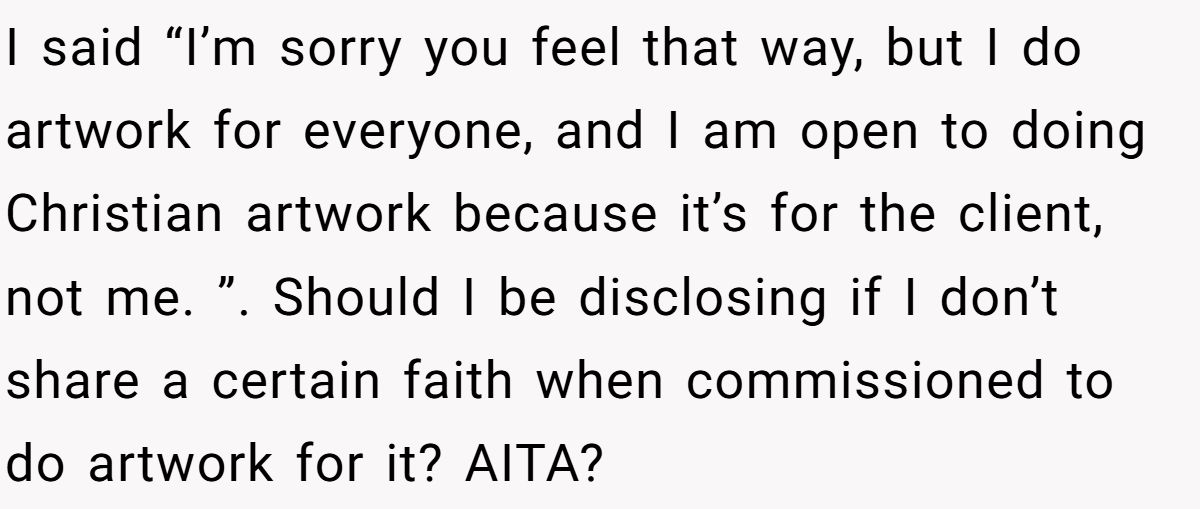 What followed was a debate not just about belief, but about the role of an artist, the expectations of clients, and where personal identity ends and professional work begins.