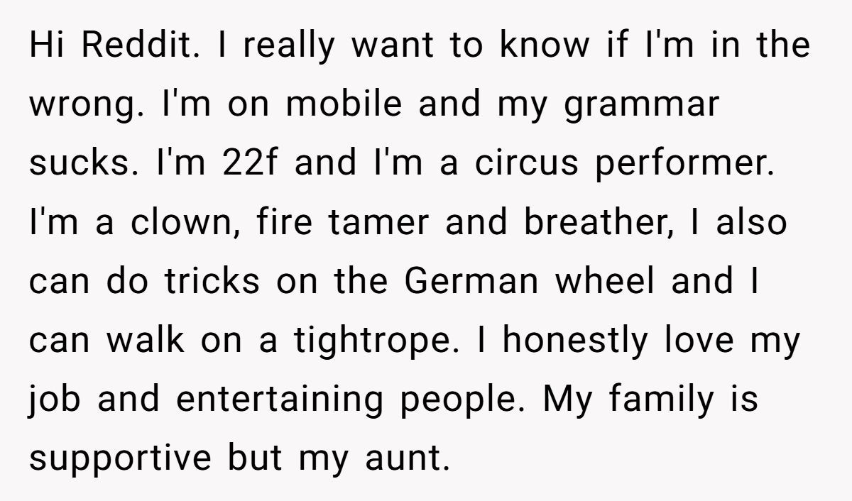 Since she first enrolled in circus school at 15, her aunt had taken every opportunity to jab at her life choices, scoffing at her costumes, laughing at her “hobby,” and once even saying, “Maybe you’ll grow up one day and get a real job.” So when that same woman came asking her to perform at her daughter’s circus-themed birthday party, she hesitated.