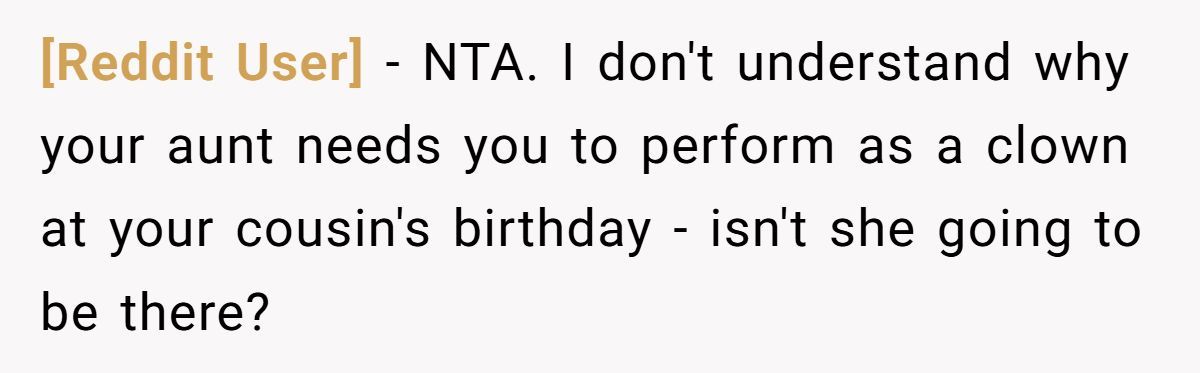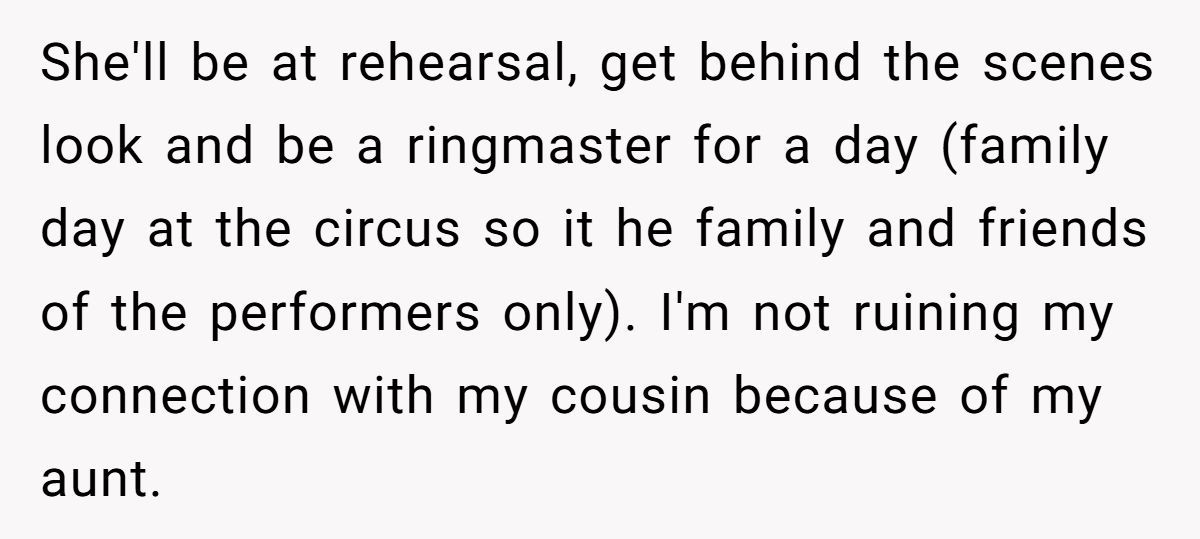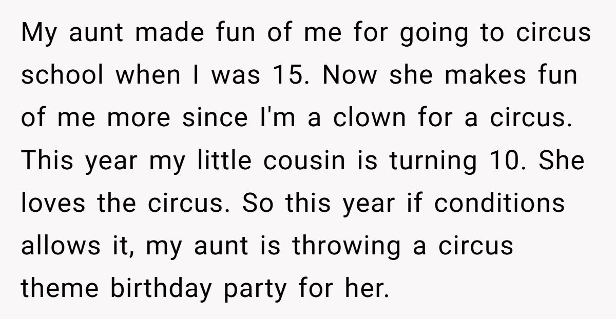 Instead of lashing out, the young woman offered a middle ground: she wouldn’t perform at the party, but she’d give her cousin a private behind-the-scenes circus experience. It was her way of honoring the child, without rewarding the adult’s disrespect. But for her aunt, that wasn’t enough. The tantrum continued.