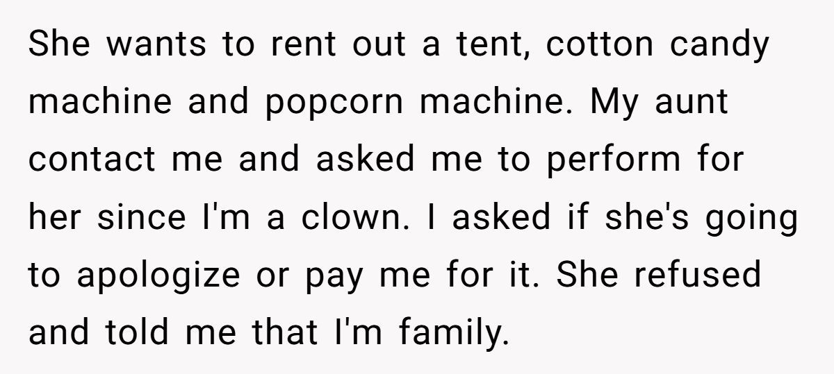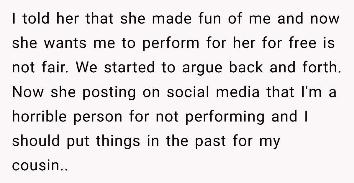 So when that same aunt came asking for a free performance at the party, no apology, no fee, just expectations, the young woman refused. What followed was a circus act in its own right: social media shaming, family group chat blowups, and a bitter showdown between artistic dignity and blood ties.