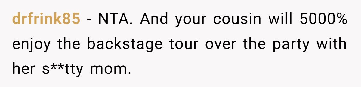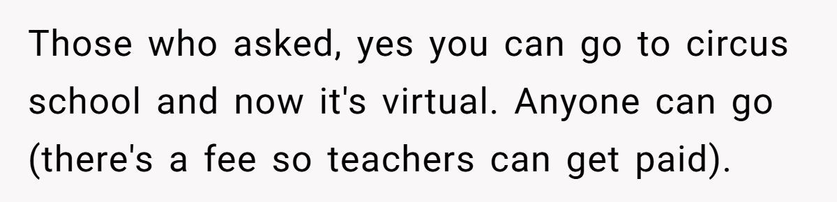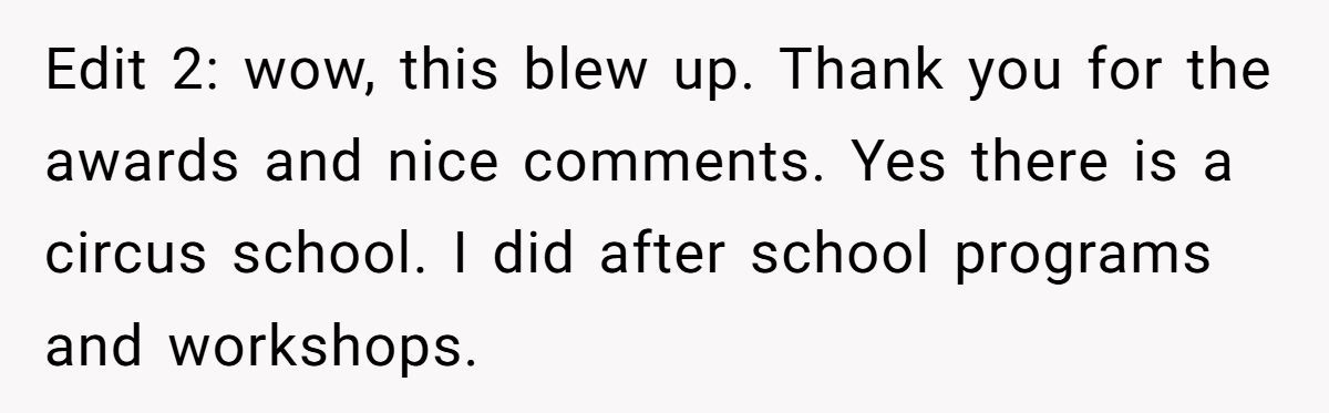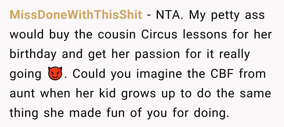 Some commenters on Reddit even suggested the perfect revenge: gift the cousin a free month of circus school, so the aunt would have to pay for the follow-up lessons. Petty? Maybe. Brilliant? Absolutely.