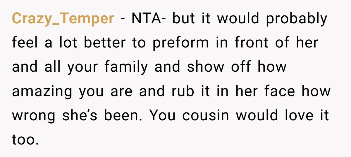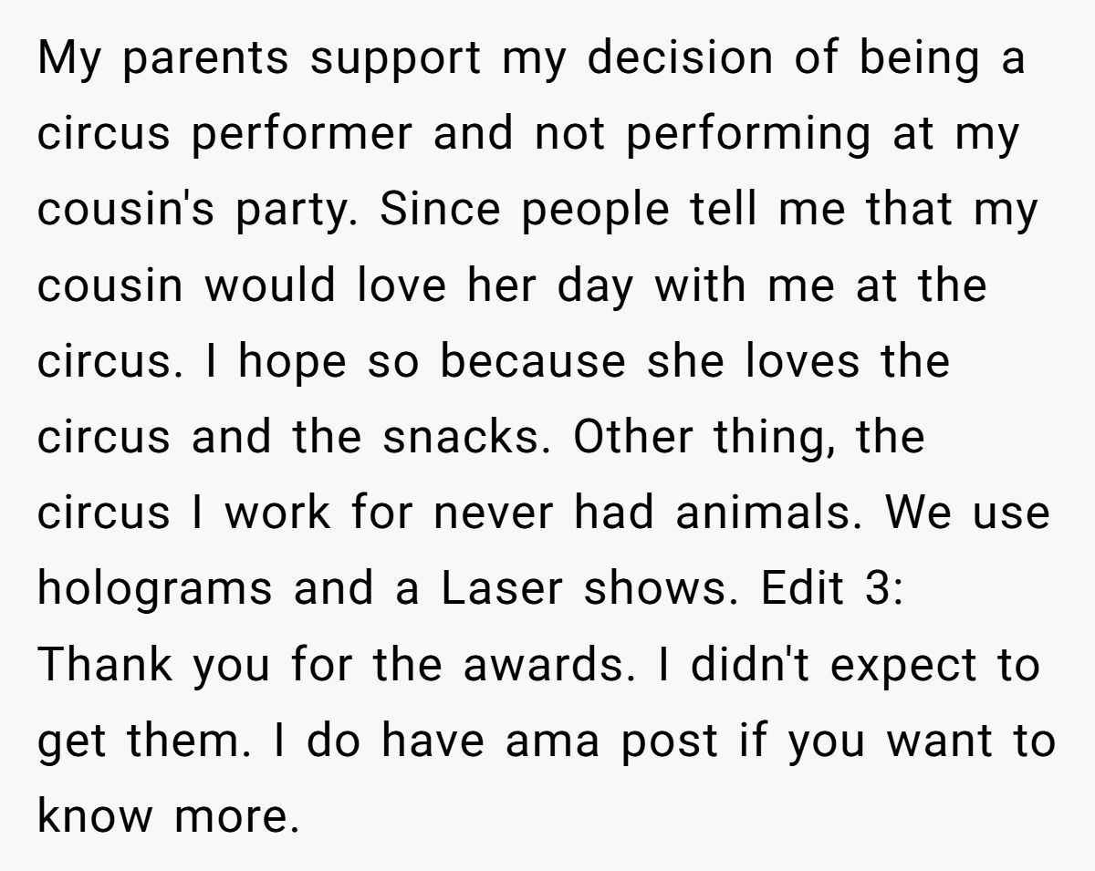 This wasn’t just a party request, it was a demand dressed in entitlement. The young circus performer didn’t just say no to unpaid labor. She said no to years of mockery, dismissal, and hypocrisy. And she did it with grace: offering her cousin a special memory while protecting her own dignity.