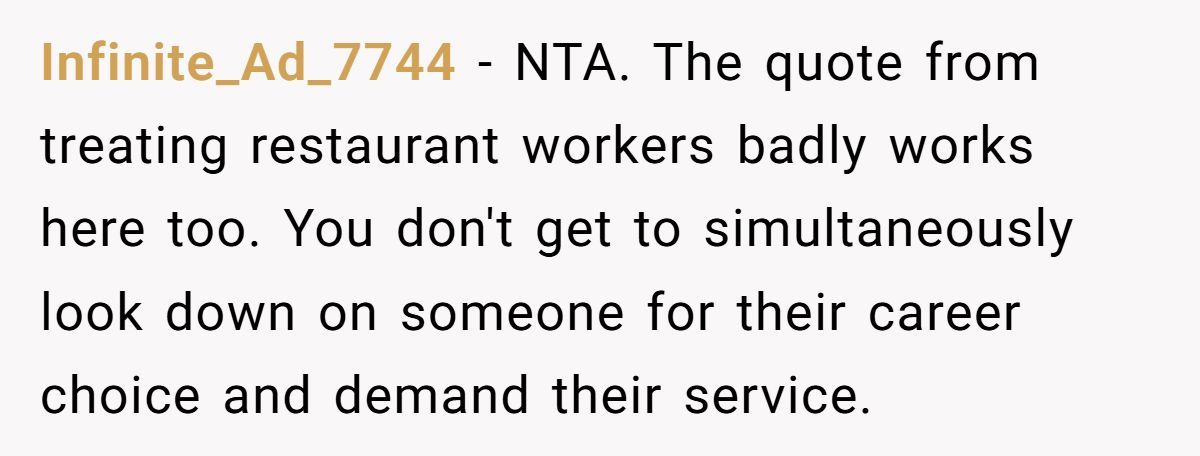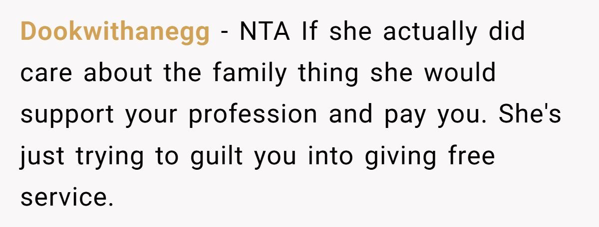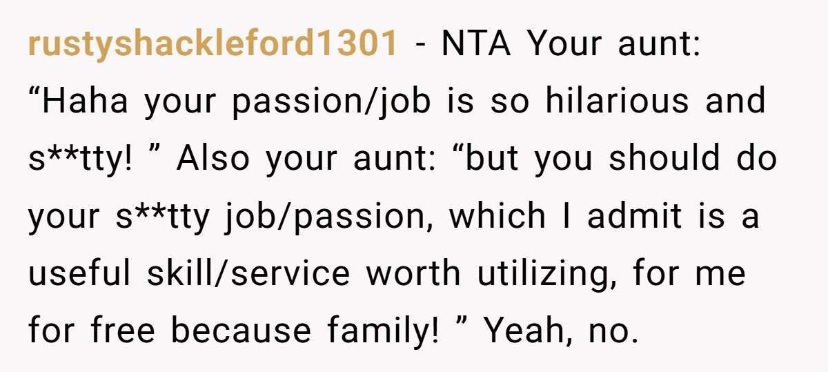 Others note that if she truly respected “family,” she’d be willing to pay, especially for a skill she clearly values enough to request. The consensus? NTA, and the aunt needs a serious reality check.