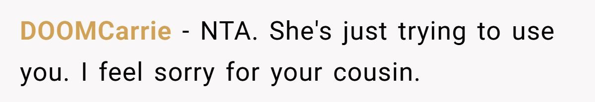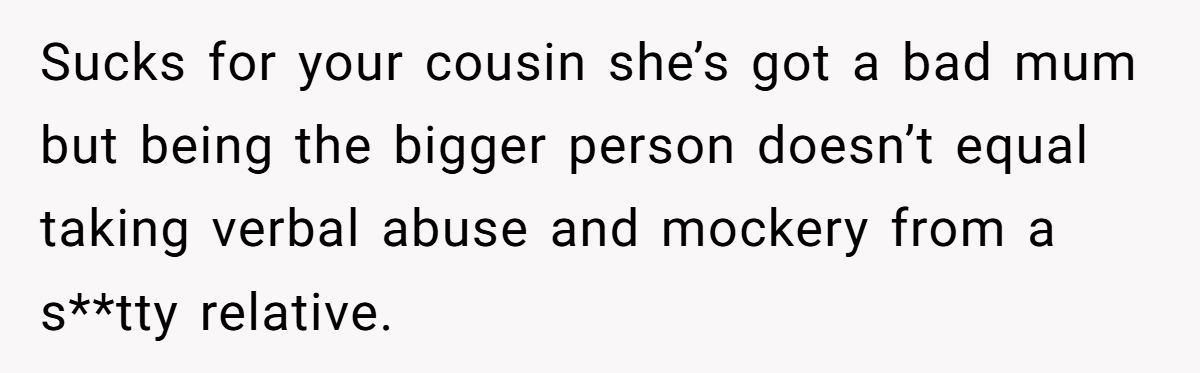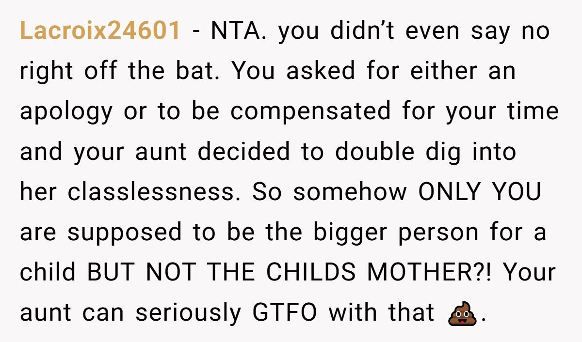 These comments add some punchy humor and righteous anger to the conversation. Most commenters back the OP firmly, slamming the aunt’s entitled behavior and hypocrisy.