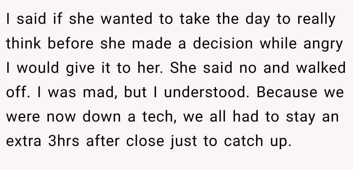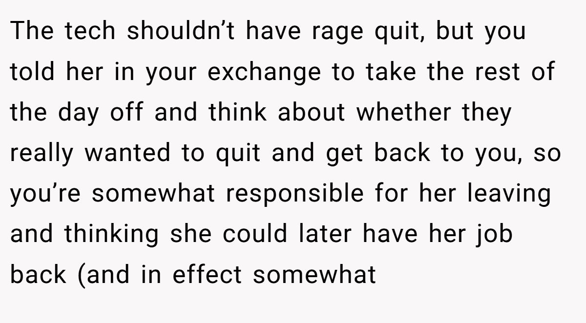 wsr3ster labeled this one an ESH and didn’t hold back. They argued that while the tech shouldn’t have rage-quit, the boss also played a part by telling her to take the day to think, which blurred the lines between quitting and cooling off.