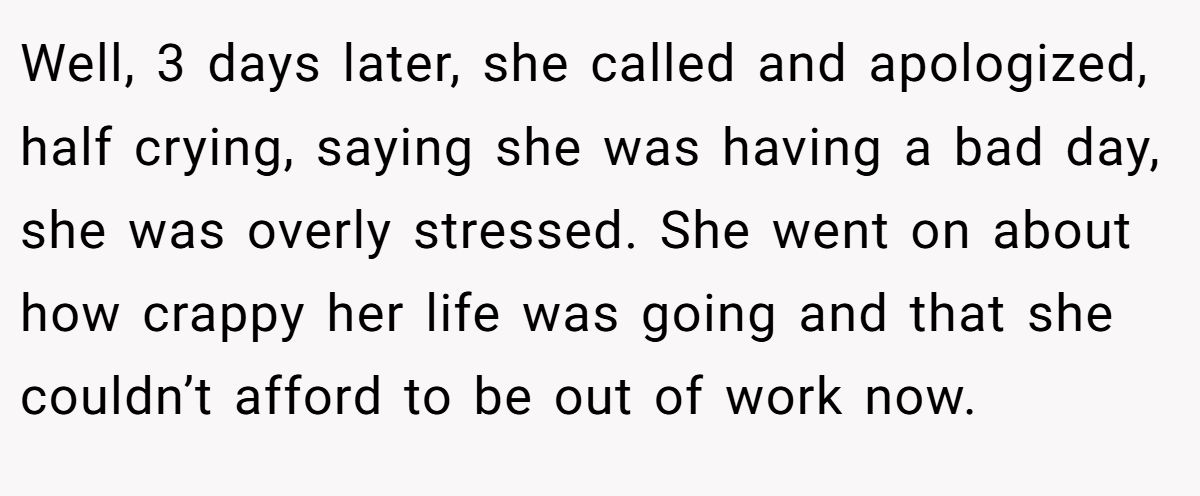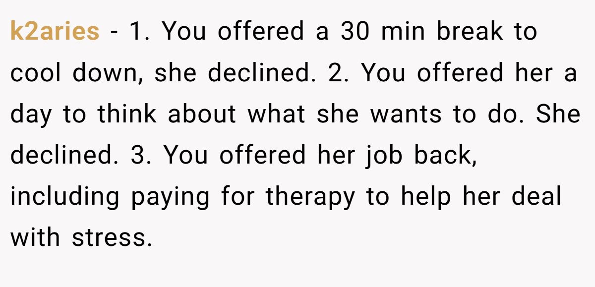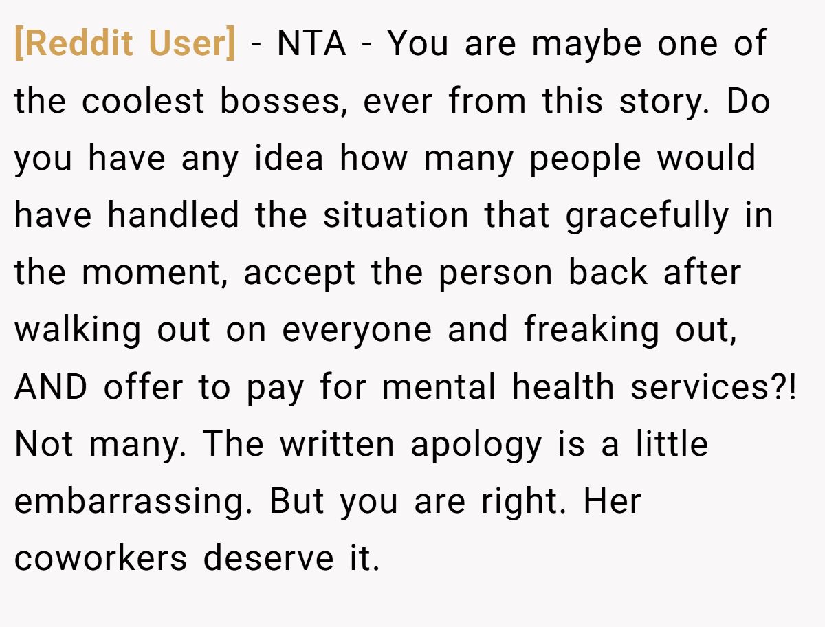 This comment gives credit where it’s due. The boss showed rare patience, generosity, and leadership under pressure. Offering mental health support isn’t just thoughtful—it’s progressive. While the written apology might sting, accountability without consequences isn’t accountability at all.