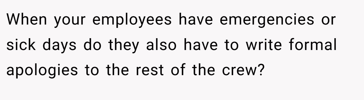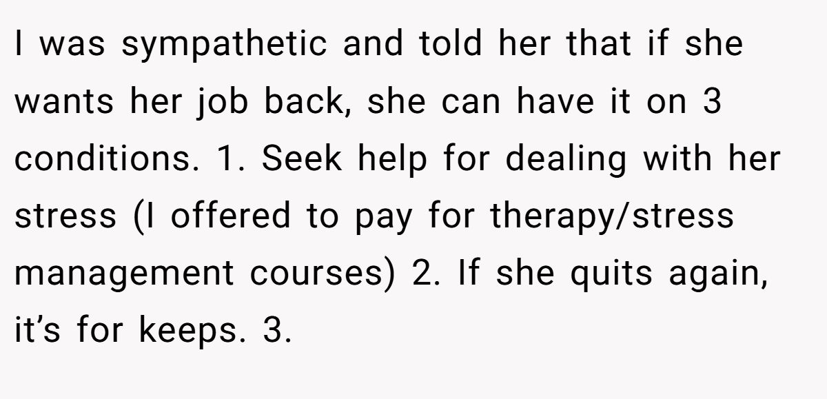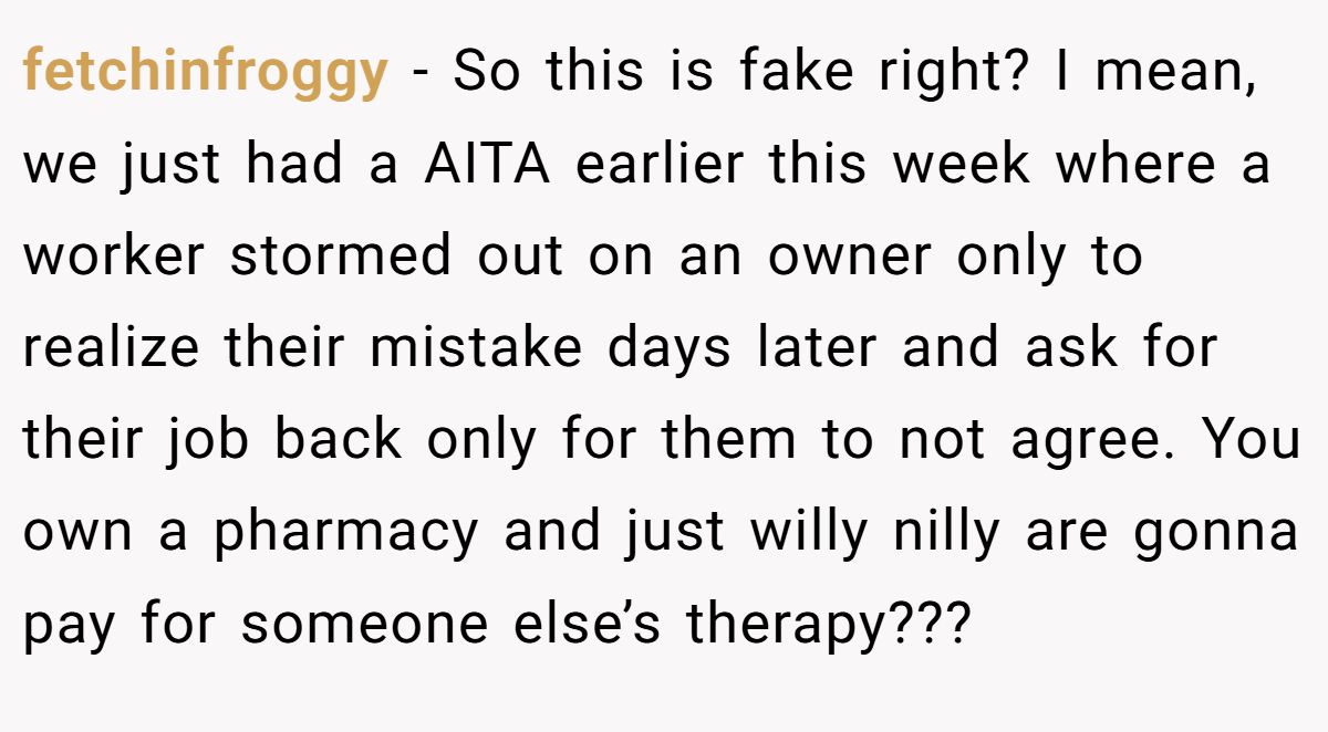 But the boss wasn’t entirely wrong either. A sudden walkout meant the team was left scrambling. His requested apology wasn’t about ego — it was about morale. Pharmacy staff had to clean up after her, working three extra hours. That leaves emotional residue, even if everyone feels for her. His terms — therapy, no more spontaneous quitting, and a team apology — weren’t unreasonable. But requiring a written apology? That shifted the tone. It echoed school punishments more than adult accountability, especially for a young worker already feeling small.