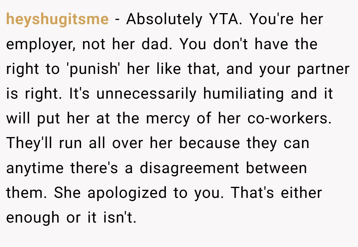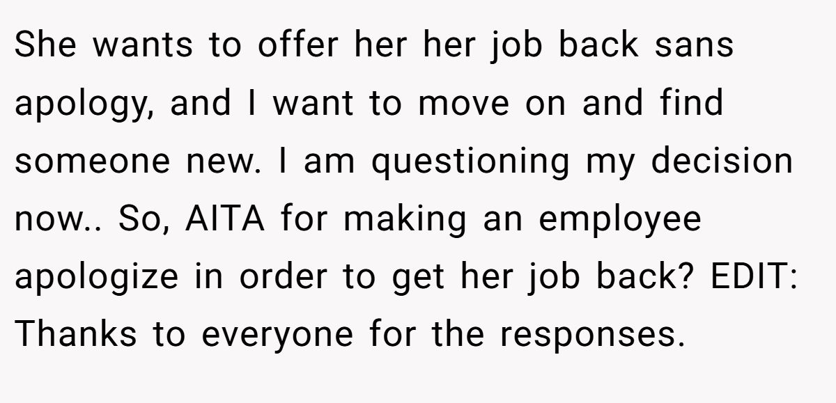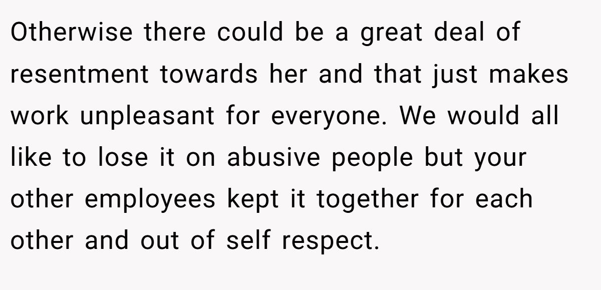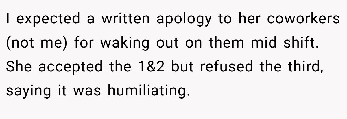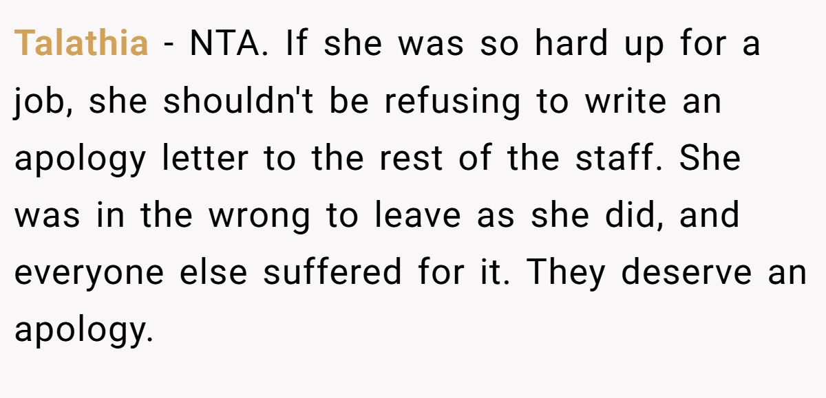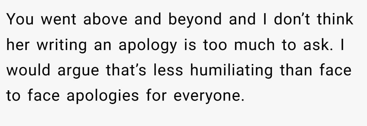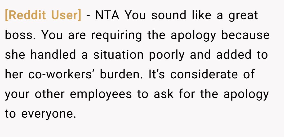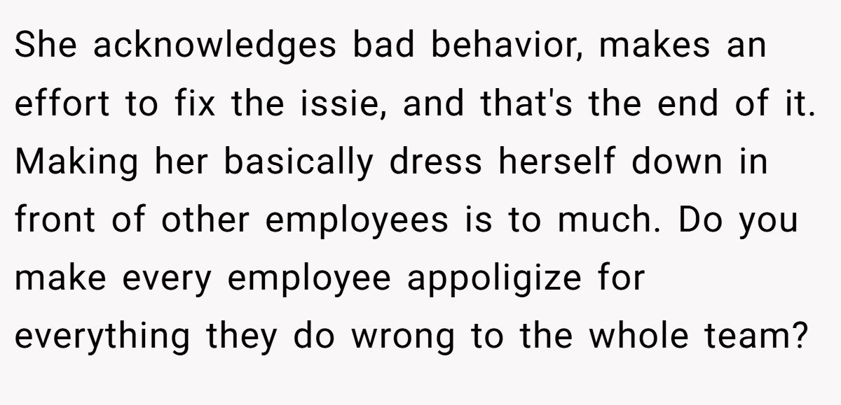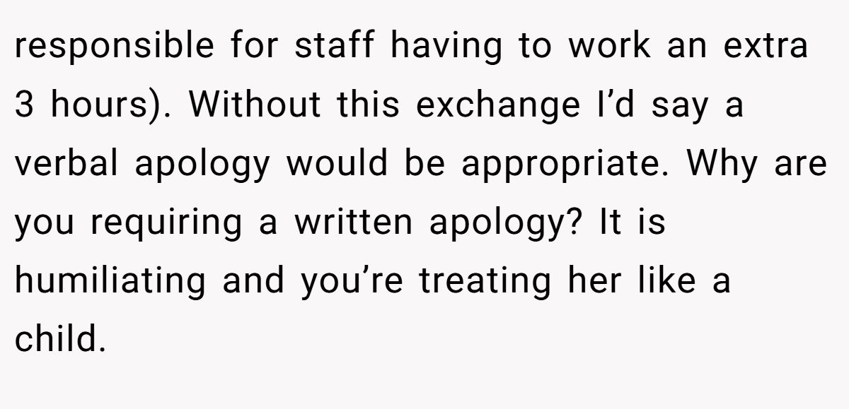 From their point of view, the written apology felt more like a punishment than a professional expectation. They argued it could weaken the employee’s standing among coworkers, leaving her vulnerable to future mistreatment. For commenters like this, a personal apology—or none at all—should have been enough, with the focus instead on rebuilding trust through support, not shame.