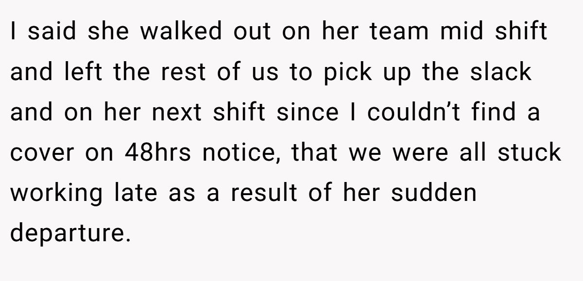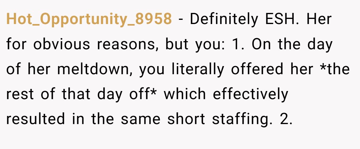 Hot_Opportunity_8958 pointed out that everyone sucks here. The employee acted out, but the boss isn’t off the hook either—they noted he essentially gave her the day off anyway, which led to the same short-staffing issue.