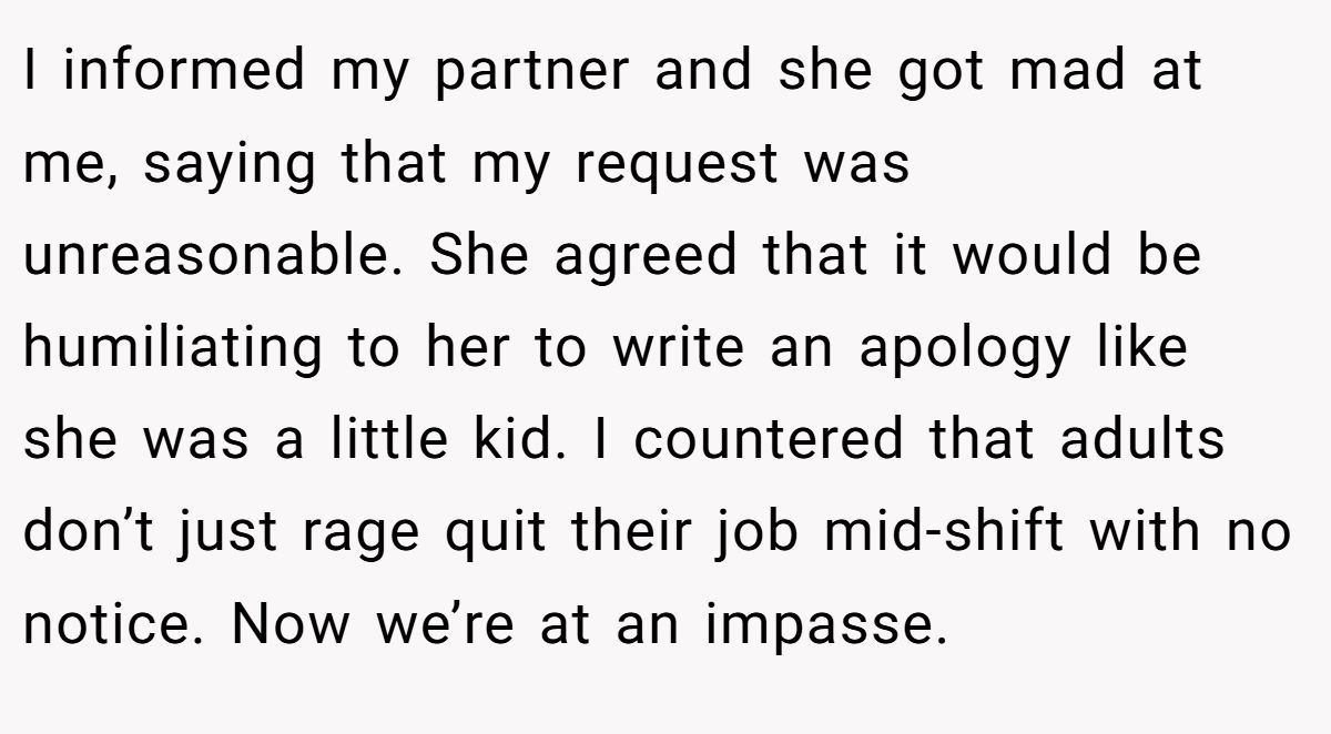 In their view, once someone owns up to their mistake and makes an effort to improve, that should be the end of it. Forcing a written apology felt over the line, like a punishment that could damage team dynamics more than heal them.