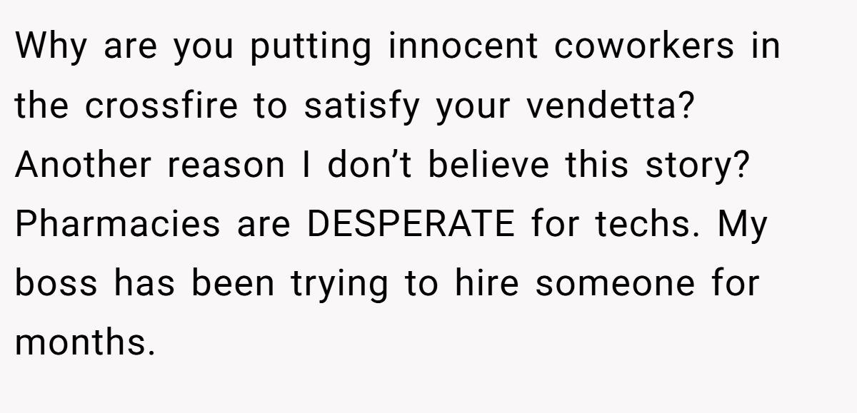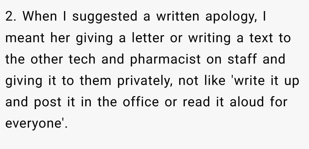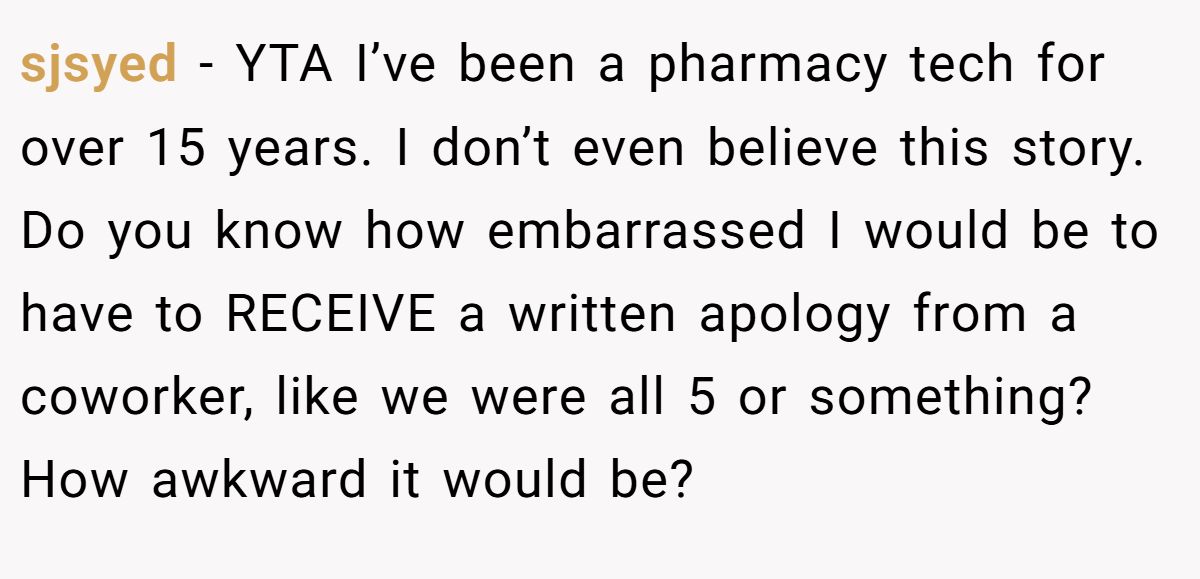 Another Redditor, sjsyed, wasn’t buying any of it. As a pharmacy tech with over 15 years on the job, they flat-out called the story unbelievable. Their take? Forcing someone to write a formal apology doesn’t just humiliate the employee—it drags the whole team into awkward territory.