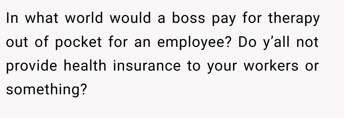 fetchinfroggy bluntly shared their skepticism, questioning whether any real boss would genuinely pay for therapy out of pocket, especially when health insurance should already be in place.