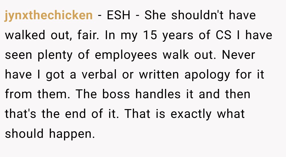 Redditor jynxthechicken, with 15 years of customer service experience, said this was nothing new—plenty of employees walk out during tough shifts, and it rarely results in formal apologies.