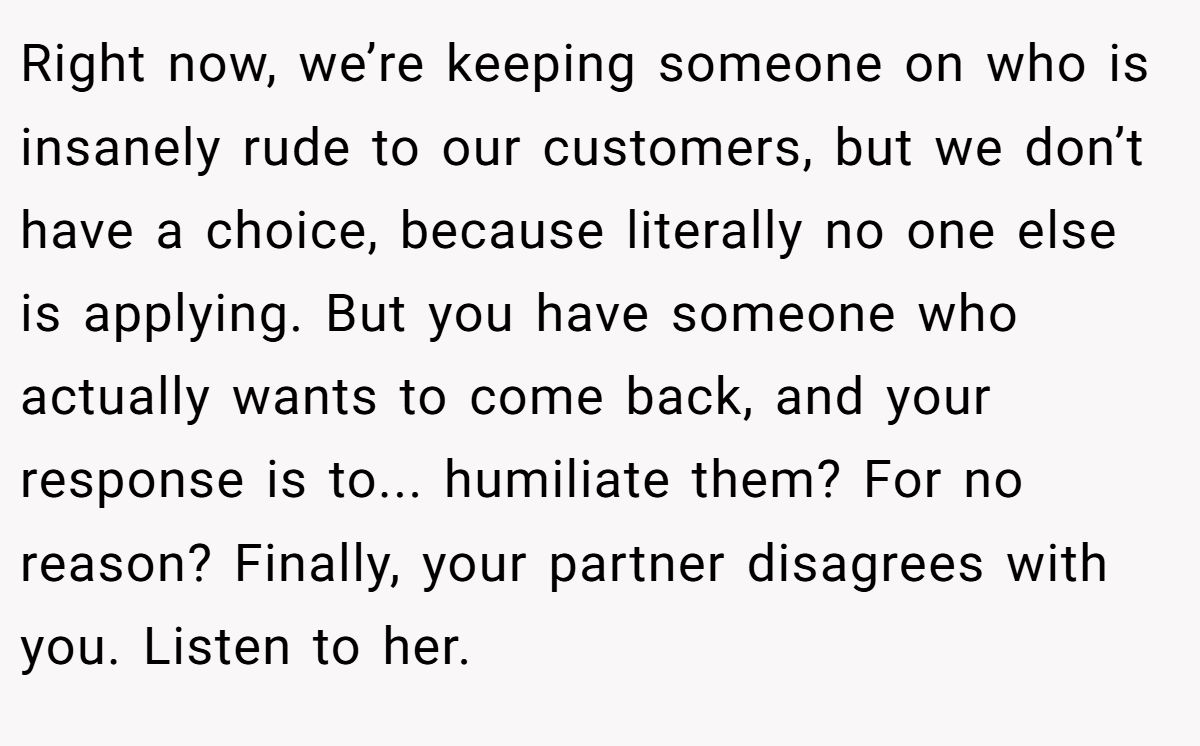 “Do you know how embarrassed I’d be to receive a letter like that?” they asked, pointing out that techs are in such short supply that most pharmacies can’t afford to lose anyone. Instead of enforcing shame, the boss should’ve welcomed someone who wanted to return. And with his own business partner disagreeing? “Listen to her,” they added.