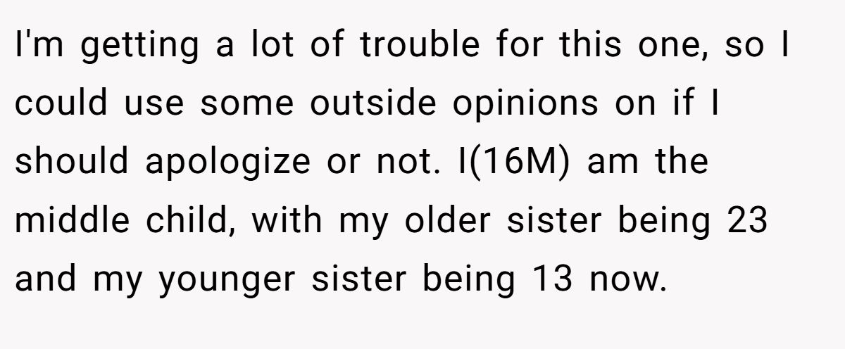 I'm getting a lot of trouble for this one, so I could use some outside opinions on if I should apologize or not. I(16M) am the middle child, with my older sister being 23 and my younger sister being 13 now.