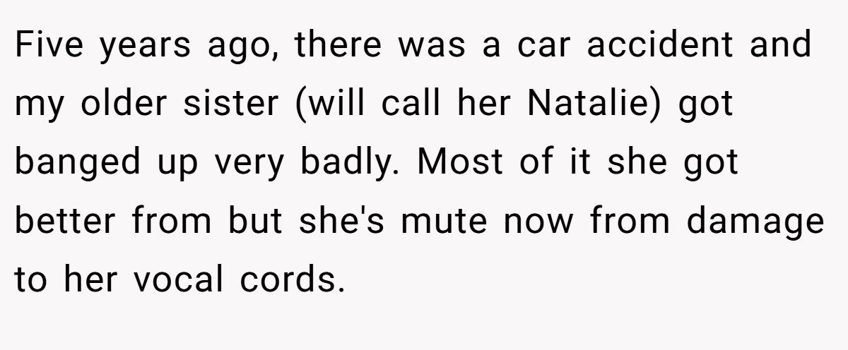 Five years ago, there was a car accident and my older sister (will call her Natalie) got banged up very badly. Most of it she got better from but she's mute now from damage to her vocal cords.