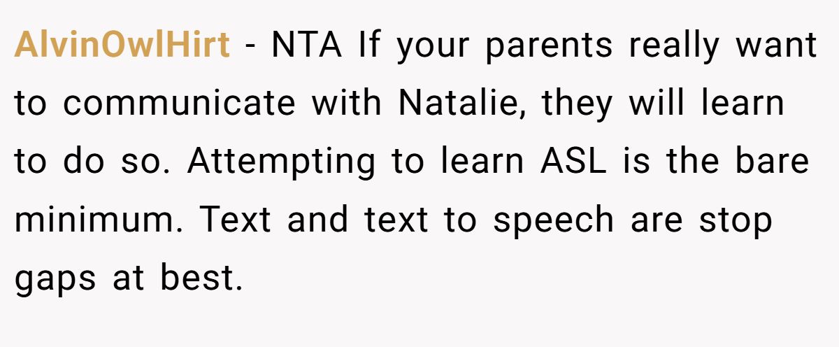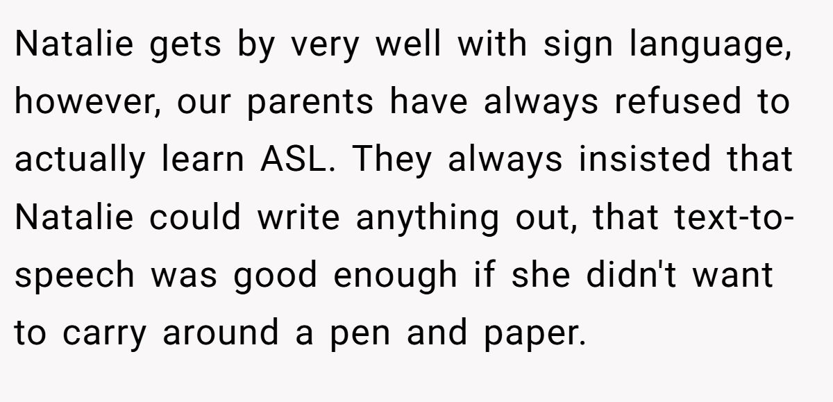 Family communication isn’t just about convenience—it’s about care. And in this story, the parents’ refusal to learn ASL speaks louder than words. While their daughter lost her ability to speak, they chose workarounds like texting and speech apps. Her brother, on the other hand, chose fluency—and connection.