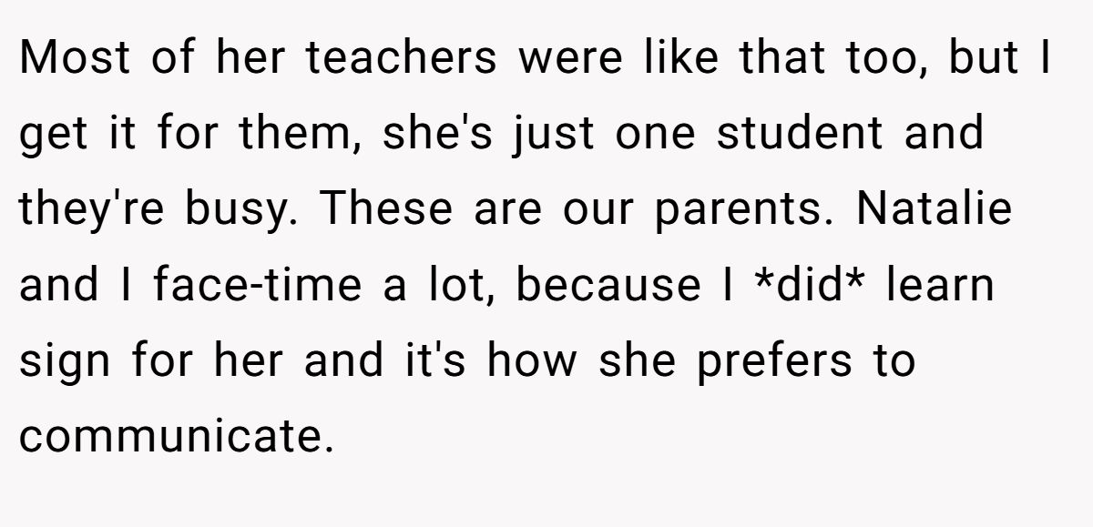 Most of her teachers were like that too, but I get it for them, she's just one student and they're busy. These are our parents. Natalie and I face-time a lot, because I *did* learn sign for her and it's how she prefers to communicate.
