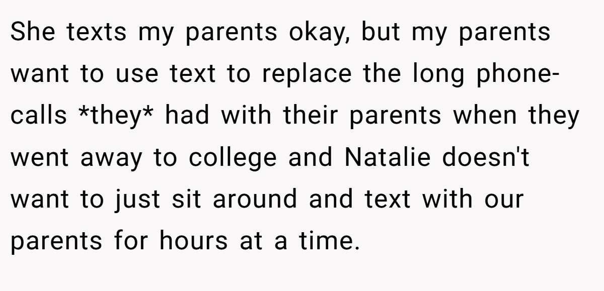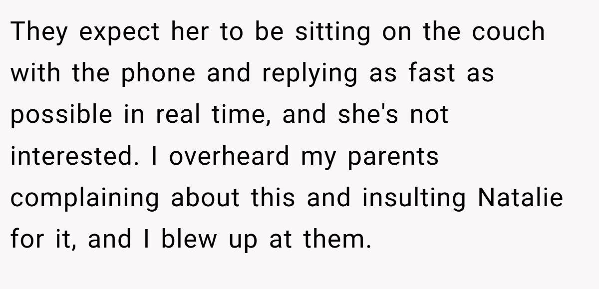 They expect her to be sitting on the couch with the phone and replying as fast as possible in real time, and she's not interested. I overheard my parents complaining about this and insulting Natalie for it, and I blew up at them.