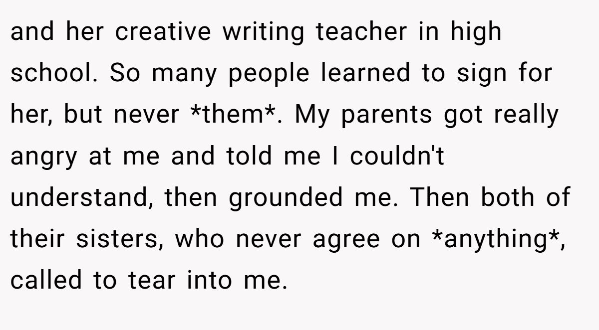 and her creative writing teacher in high school. So many people learned to sign for her, but never *them*. My parents got really angry at me and told me I couldn't understand, then grounded me. Then both of their sisters, who never agree on *anything*, called to tear into me.