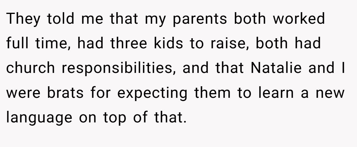They told me that my parents both worked full time, had three kids to raise, both had church responsibilities, and that Natalie and I were brats for expecting them to learn a new language on top of that.