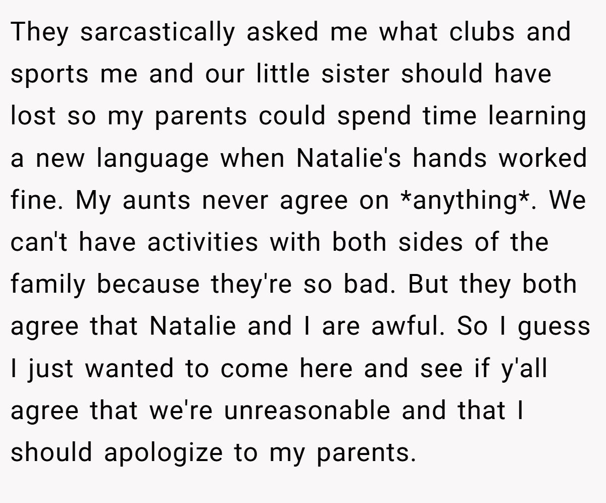 They sarcastically asked me what clubs and sports me and our little sister should have lost so my parents could spend time learning a new language when Natalie's hands worked fine. My aunts never agree on *anything*. We can't have activities with both sides of the family because they're so bad. But they both agree that Natalie and I are awful. So I guess I just wanted to come here and see if y'all agree that we're unreasonable and that I should apologize to my parents.