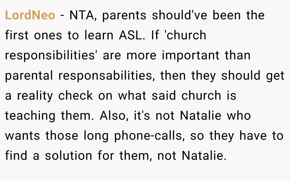 LordNeo − NTA, parents should've been the first ones to learn ASL. If 'church responsibilities' are more important than parental responsabilities, then they should get a reality check on what said church is teaching them. Also, it's not Natalie who wants those long phone-calls, so they have to find a solution for them, not Natalie.