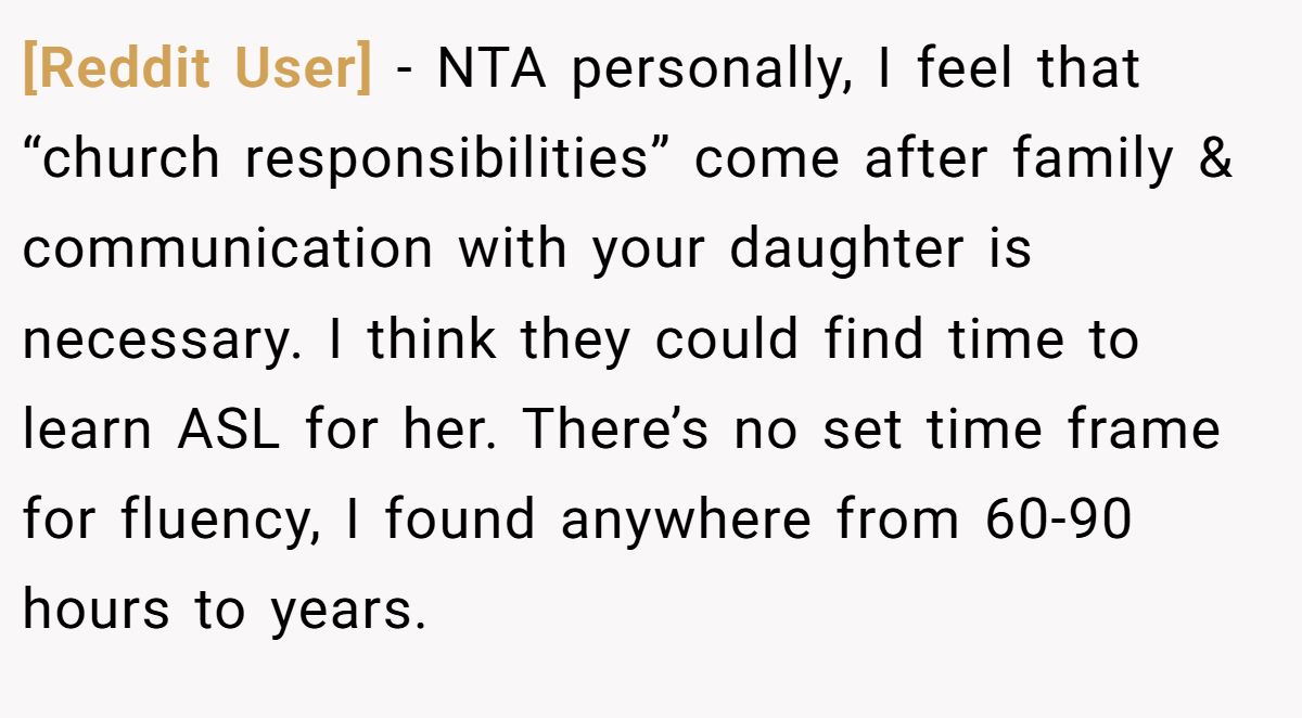 [Reddit User] − NTA personally, I feel that “church responsibilities” come after family & communication with your daughter is necessary. I think they could find time to learn ASL for her. There’s no set time frame for fluency, I found anywhere from 60-90 hours to years.