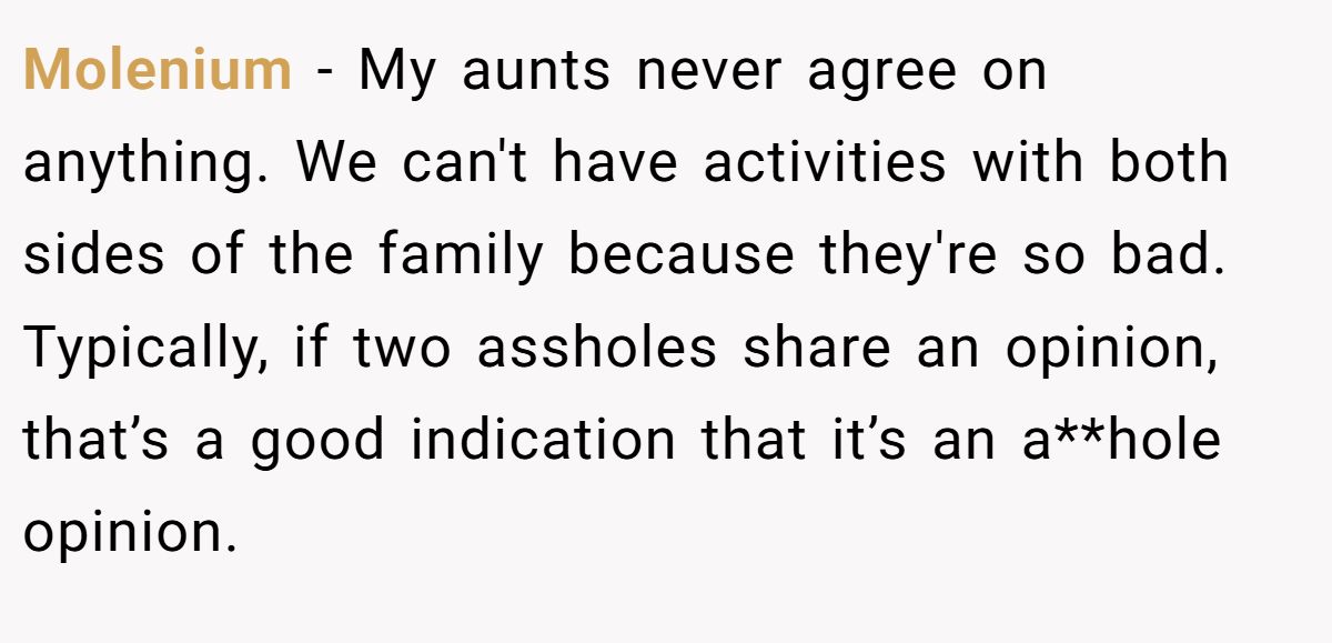 Molenium suggested the aunts’ agreement signals their own bias, not the Redditor’s fault.