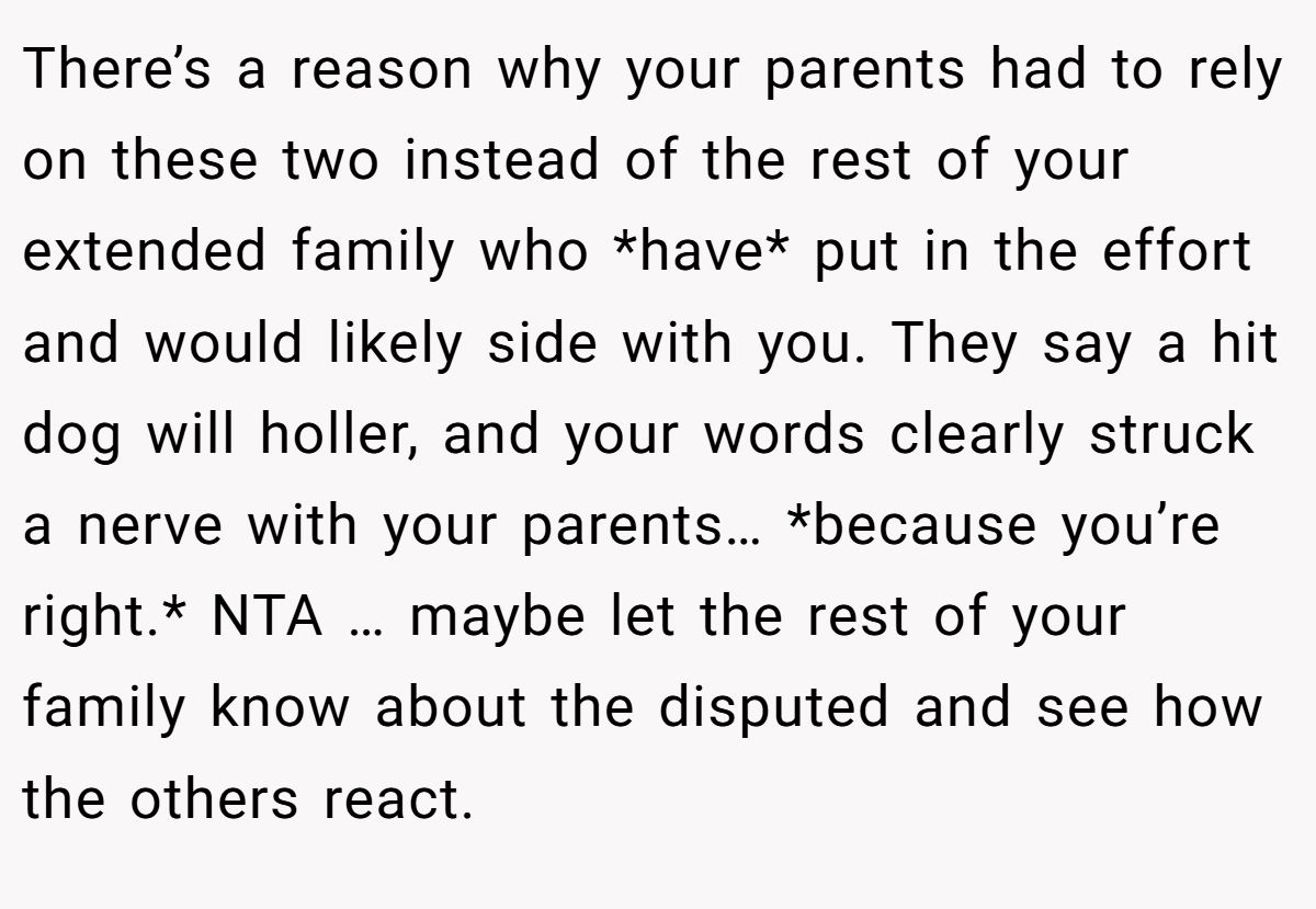 There’s a reason why your parents had to rely on these two instead of the rest of your extended family who *have* put in the effort and would likely side with you. They say a hit dog will holler, and your words clearly struck a nerve with your parents… *because you’re right.* NTA … maybe let the rest of your family know about the disputed and see how the others react.