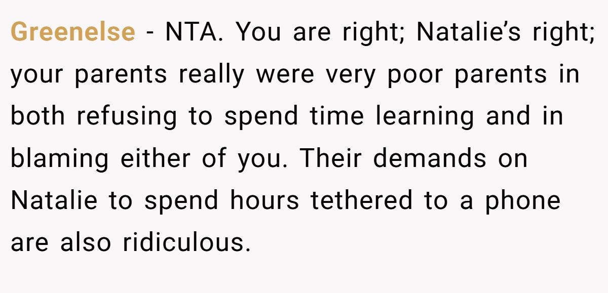 Greenelse − NTA. You are right; Natalie’s right; your parents really were very poor parents in both refusing to spend time learning and in blaming either of you. Their demands on Natalie to spend hours tethered to a phone are also ridiculous.