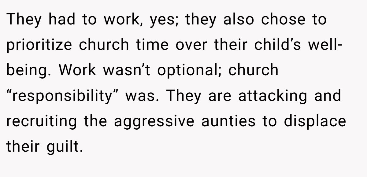 They had to work, yes; they also chose to prioritize church time over their child’s well-being. Work wasn’t optional; church “responsibility” was. They are attacking and recruiting the aggressive aunties to displace their guilt.