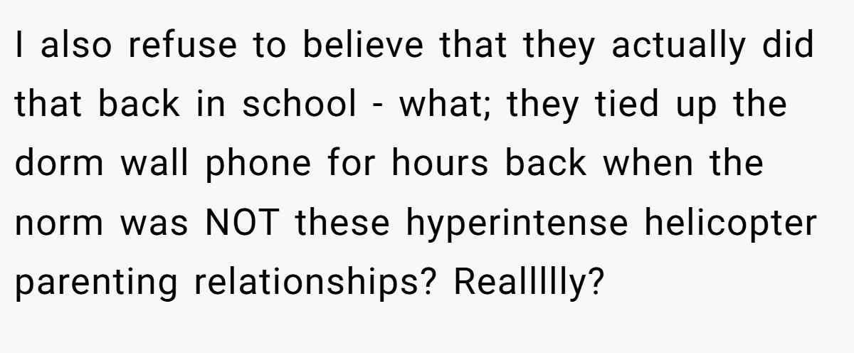 I also refuse to believe that they actually did that back in school - what; they tied up the dorm wall phone for hours back when the norm was NOT these hyperintense helicopter parenting relationships? Reallllly?