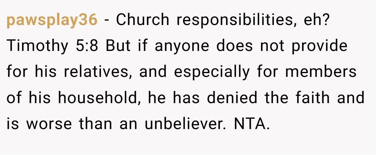 pawsplay36 − Church responsibilities, eh? Timothy 5:8 But if anyone does not provide for his relatives, and especially for members of his household, he has denied the faith and is worse than an unbeliever. NTA.