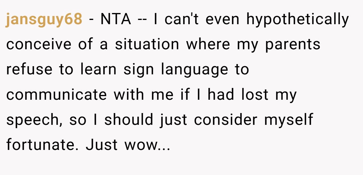 jansguy68 − NTA -- I can't even hypothetically conceive of a situation where my parents refuse to learn sign language to communicate with me if I had lost my speech, so I should just consider myself fortunate. Just wow...