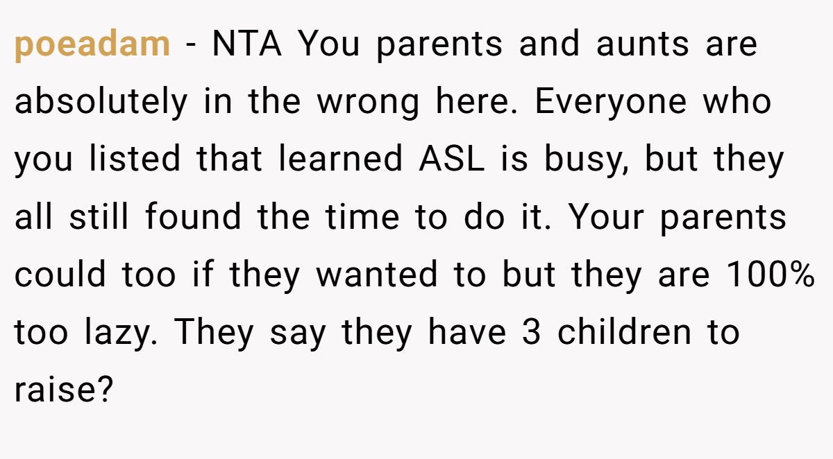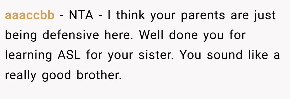 Reddit’s sign language supporters rallied behind OP, slamming his parents’ excuses and cheering his loyalty.