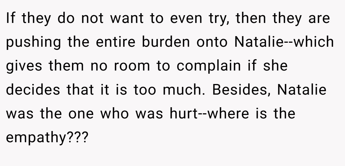 If they do not want to even try, then they are pushing the entire burden onto Natalie--which gives them no room to complain if she decides that it is too much. Besides, Natalie was the one who was hurt--where is the empathy???