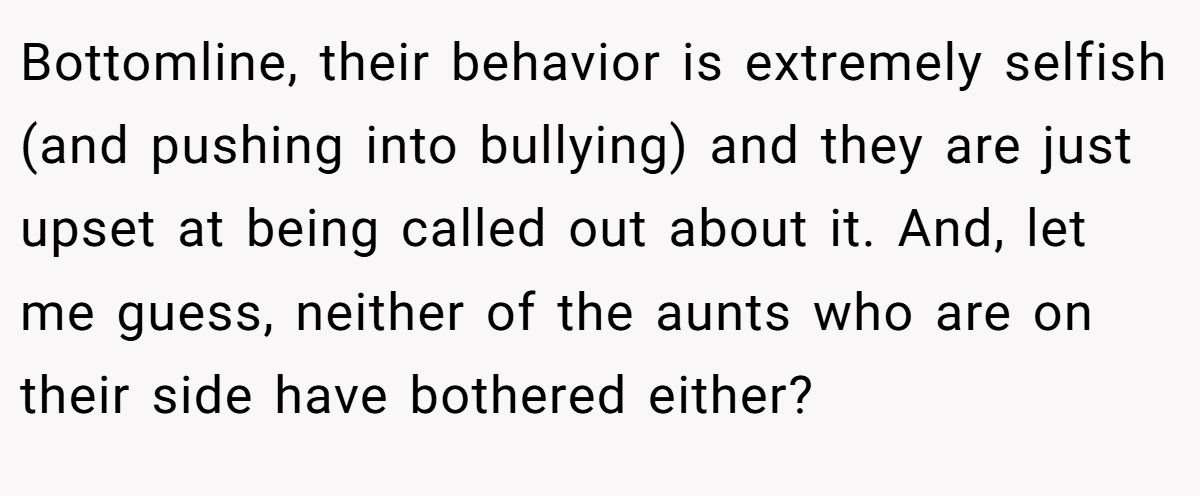 Bottomline, their behavior is extremely selfish (and pushing into bullying) and they are just upset at being called out about it. And, let me guess, neither of the aunts who are on their side have bothered either?