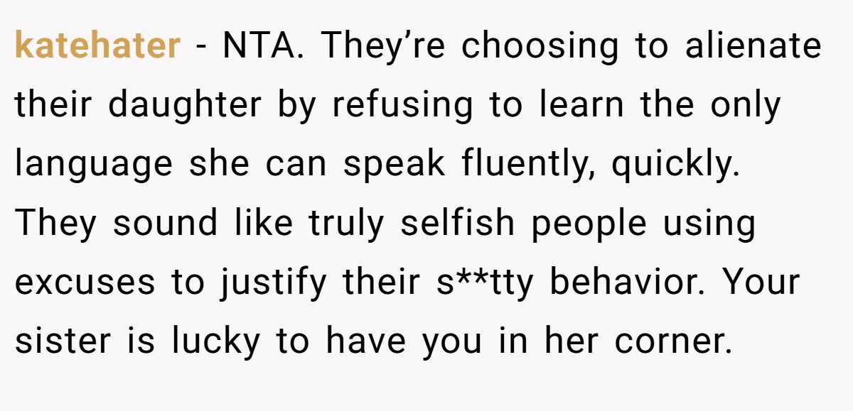 katehater − NTA. They’re choosing to alienate their daughter by refusing to learn the only language she can speak fluently, quickly. They sound like truly selfish people using excuses to justify their s**tty behavior. Your sister is lucky to have you in her corner.