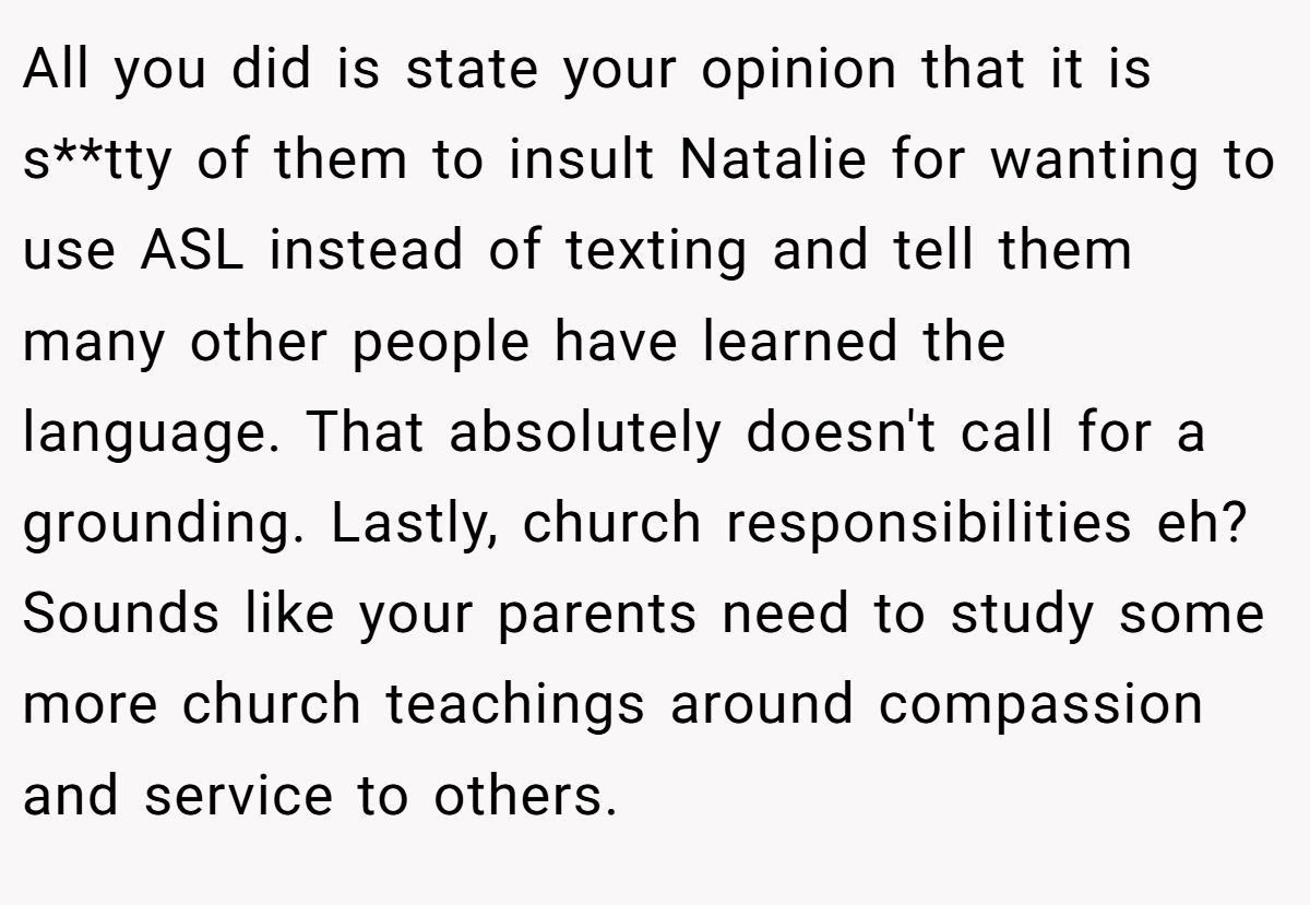 All you did is state your opinion that it is s**tty of them to insult Natalie for wanting to use ASL instead of texting and tell them many other people have learned the language. That absolutely doesn't call for a grounding. Lastly, church responsibilities eh? Sounds like your parents need to study some more church teachings around compassion and service to others.