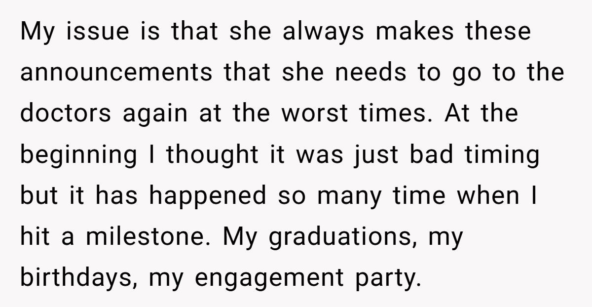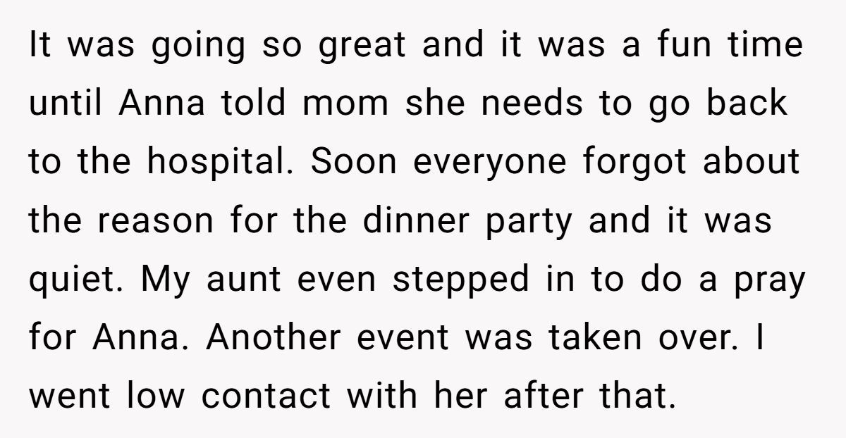 Every time a special moment came around, be it a birthday, a graduation, or even the bride’s engagement party, Anna had a way of redirecting the attention. A sudden diagnosis, an unexpected health update, or a mysterious fainting spell would surface just in time to shift the focus.