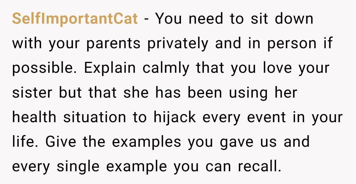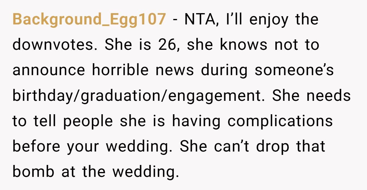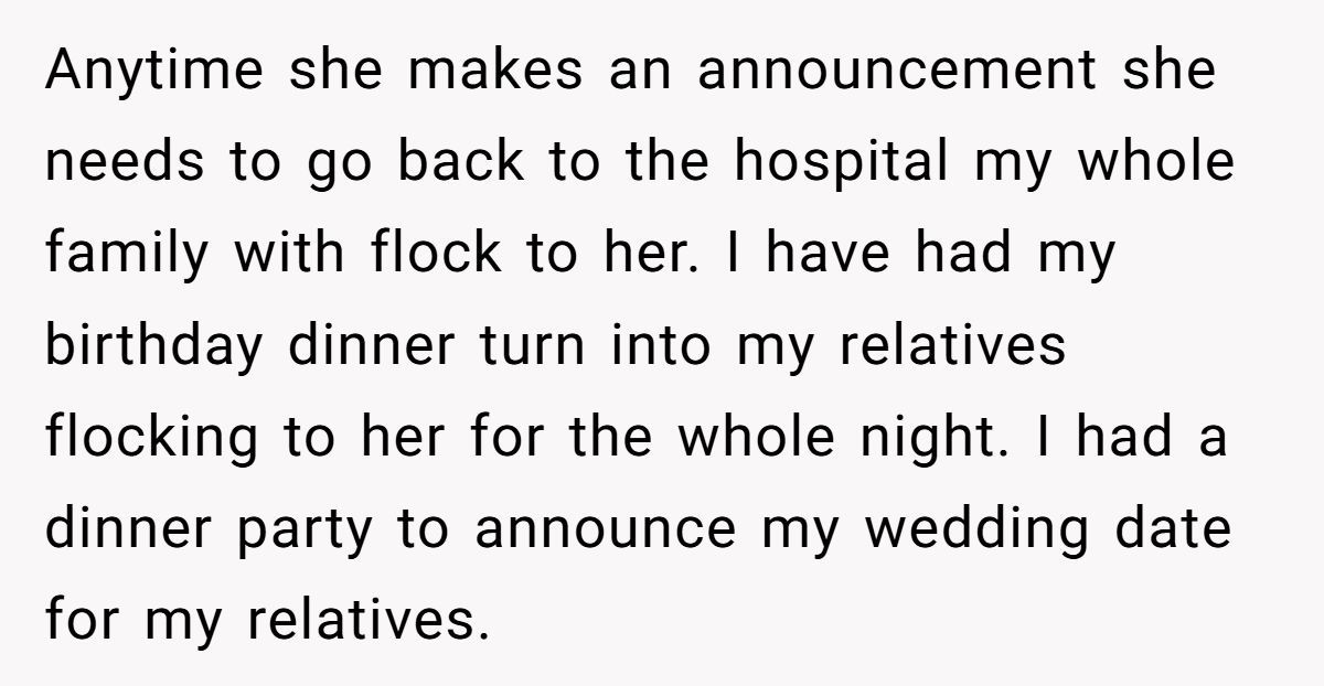 Many agreed the sister was attention-seeking by timing health announcements during others’ big events.