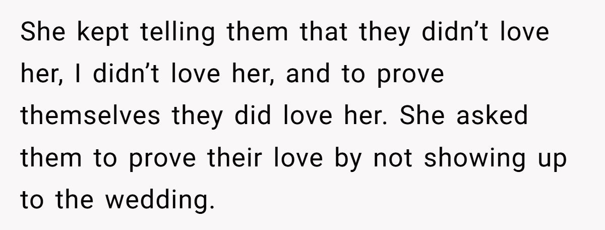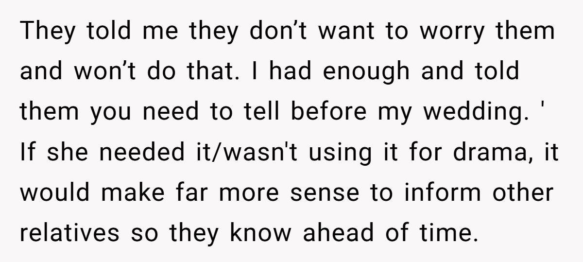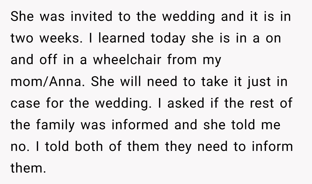 So when the bride announced her wedding plans, she braced herself. And right on cue, weeks before the big day, Anna showed up in a wheelchair. No medical explanation. No conversation. Just silent theatrics. And when asked to inform guests ahead of time, simply to avoid confusion or unwanted attention, Anna refused.
